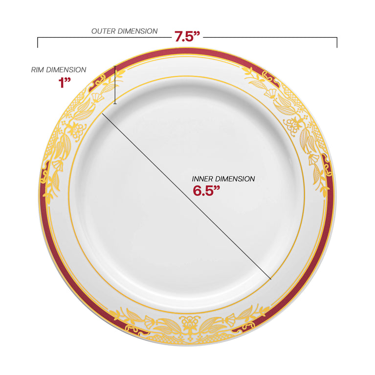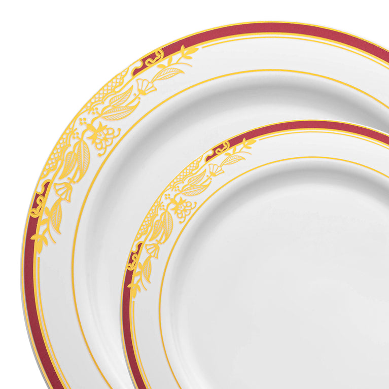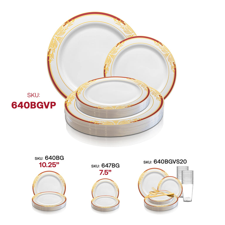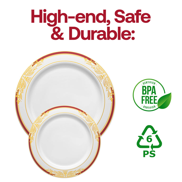 White with Burgundy and Gold Harmony Rim Plastic Dinnerware Value Set