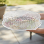 Elevate your entertaining with these 16" Clear Round Plastic Trays with Lids—an essential choice for anyone who wants to serve beautiful, fresh, and well-presented food with ease. These trays combine durability, clarity, and convenience, making them ideal for both home celebrations and professional catering. Their crystal-clear surface highlights your appetizers, desserts, and snacks, while the fitted lids keep everything covered, protected, and ready to transport.