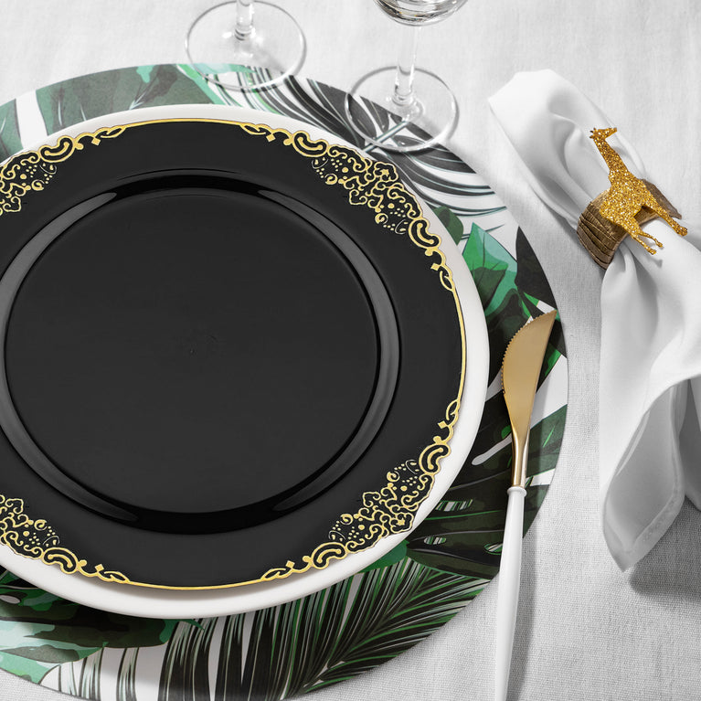 Designed with meticulous attention to detail, each plate features a sleek black base complemented by radiant gold details, creating a striking contrast that enhances your table setting. Whether you're hosting a wedding reception, corporate event, or upscale dinner party, these plastic salad plates will impress your guests.