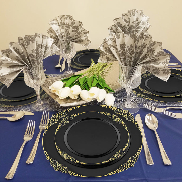 Add a touch of glamour to your next celebration or gathering, and make every meal a memorable experience with our fancy black with gold disposable plastic salad plates, a perfect blend of sophistication and convenience. Crafted to meet the highest standards of style and durability, these 7.5-inch plates are ideal for both casual gatherings and formal events, adding a touch of elegance to any occasion. Designed with meticulous attention to detail, each plate features a sleek black base complemented by...