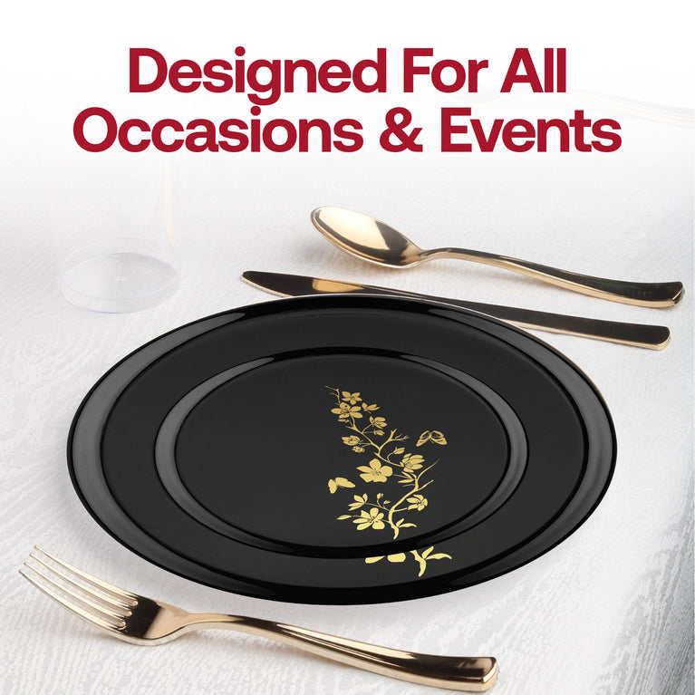 Petite Glamour for Desserts & Sweet Moments Elevate your dessert table with these 6.25" black plastic pastry plates featuring a metallic-gold floral rim. Perfect for macarons, mini tarts, canapés, or cake slices, they bring boutique style to any event. Available in bulk packs, including 120-count options for stress-free entertaining. Features 6.25" Diameter: Ideal for desserts and small bites. Black & Gold Floral: Sophisticated, photo-ready design. Durable Plastic: Sturdy, resists bending and leaks. Disposable: Easy cleanup after parties. Multiple Pack Options:...
