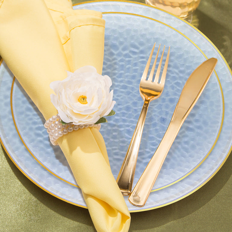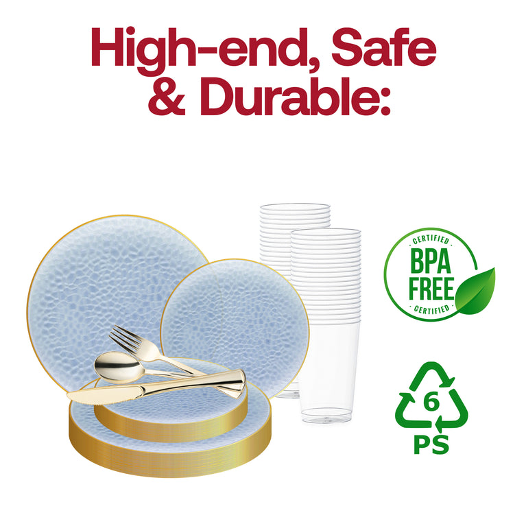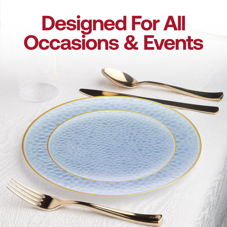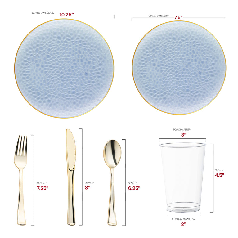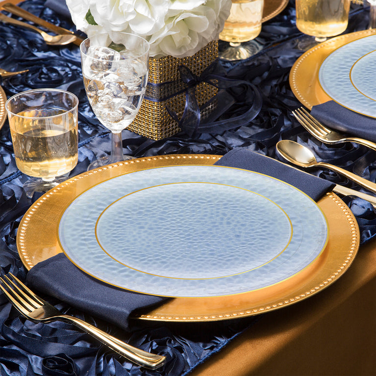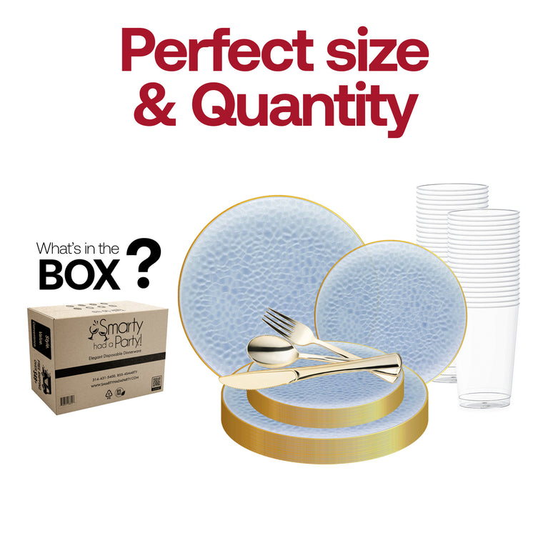 Clear Blue with Gold Rim Hammered Glass Disposable Plastic Wedding Value Set