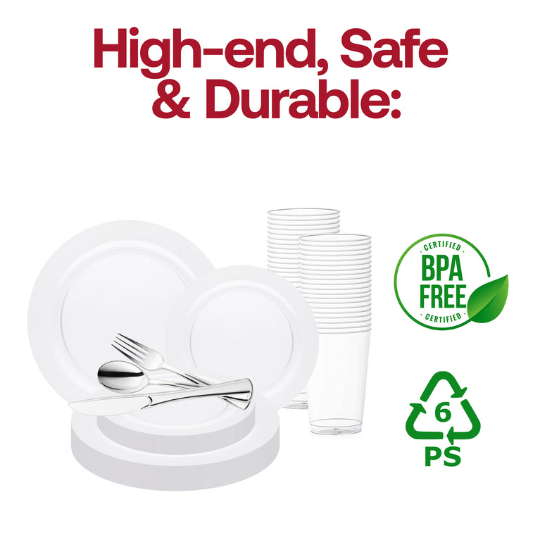 With crystal-clear round dinner and salad plates, matching tumblers, and a sleek plastic cutlery set, your wedding table will look polished and cohesive from first toast to last bite. Ideal for modern brides, event planners, and hosts seeking upscale plastic wedding plates and disposable wedding tableware without the stress of rentals or long cleanup.