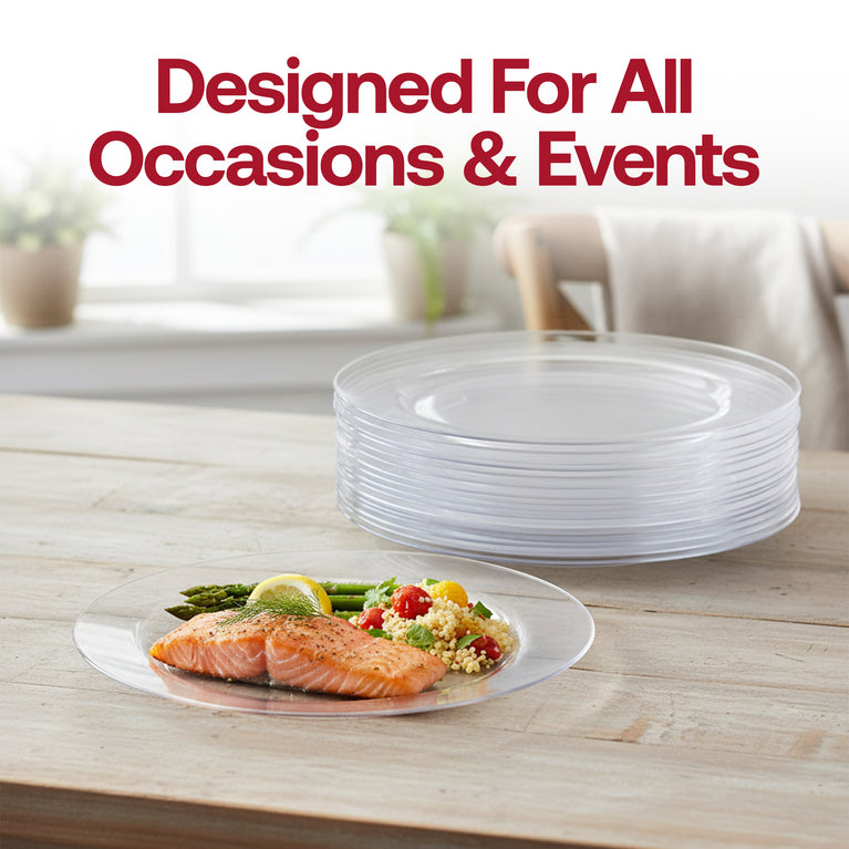 Clear Round Dinner Plates: Generously sized to hold entrees, buffets, and hearty portions.