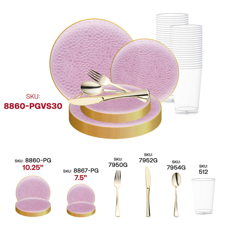 Clear Pink with Gold Rim Hammered Glass Disposable Plastic Wedding Value Set