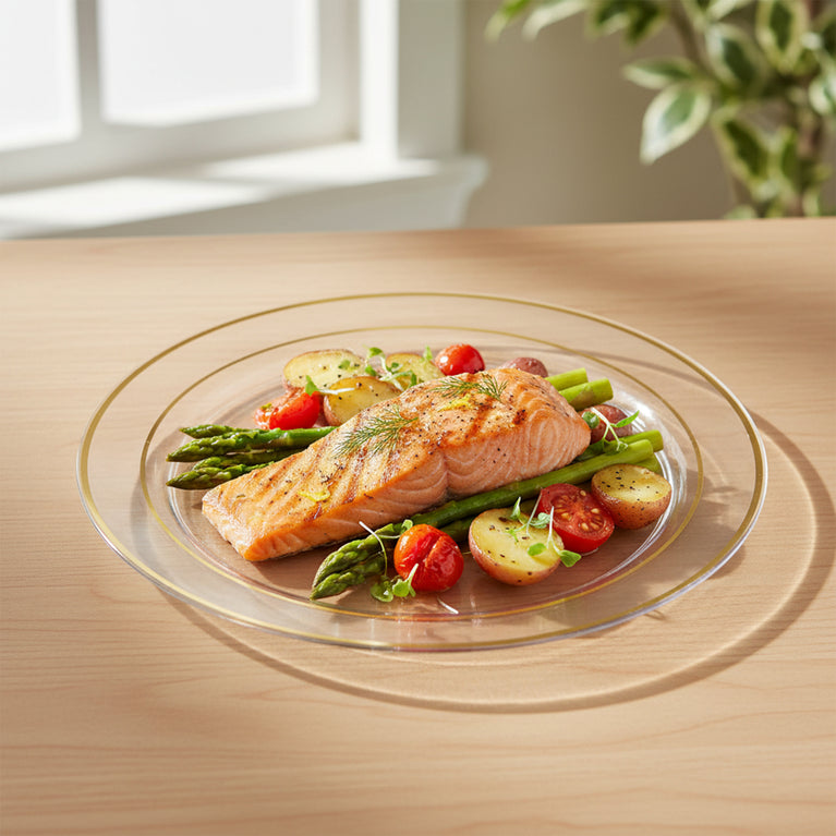 These 7.5" clear plastic salad plates with a gold rim bring the look of fine china with disposable convenience. Made from sturdy, BPA-free plastic, they’re perfect for salads, appetizers, small desserts, and tasting courses. Stackable and reusable with gentle handwash, they’re ideal for weddings, holidays, cocktail parties, and everyday entertaining. Pair with dinner plates, tumblers, and gold cutlery for a cohesive, photo-ready tablescape.