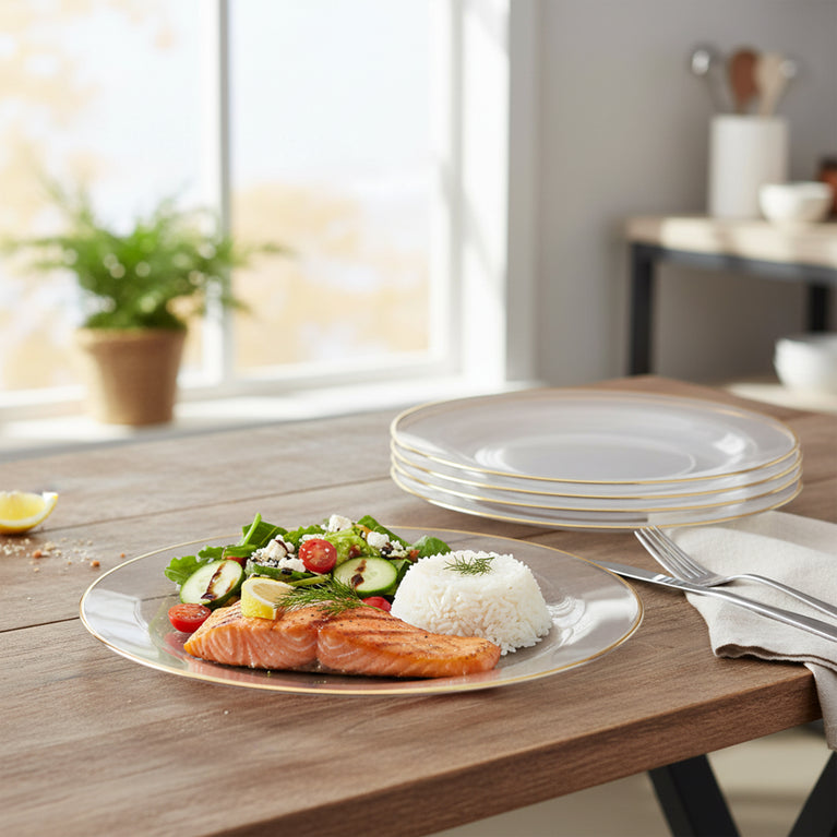 - Plates: Clear with Gold Rim