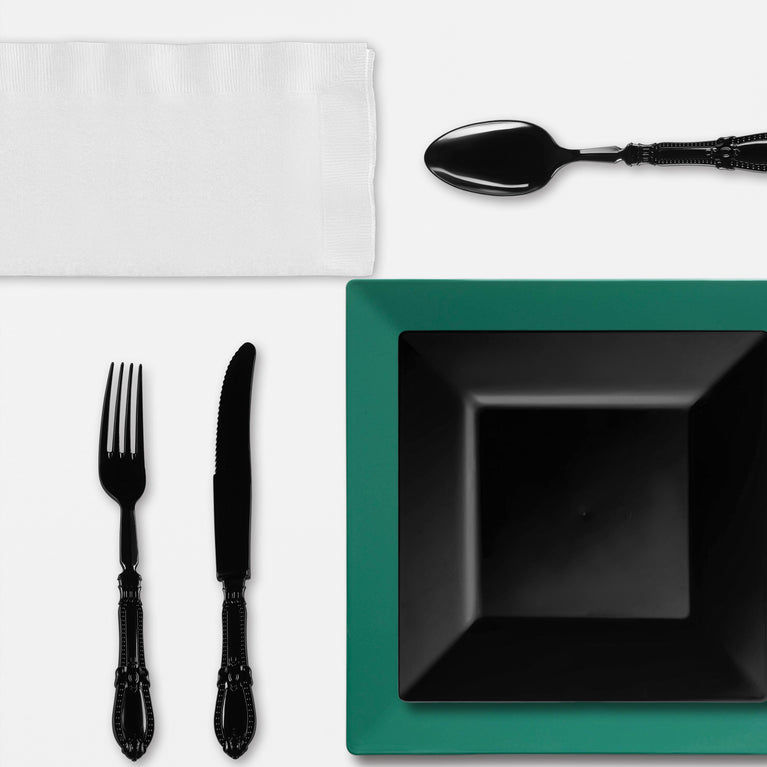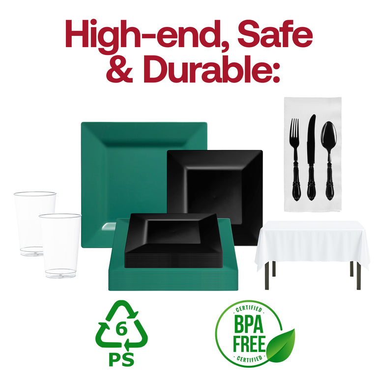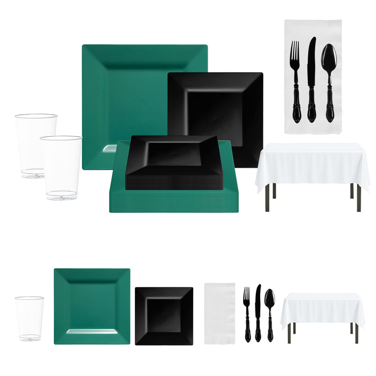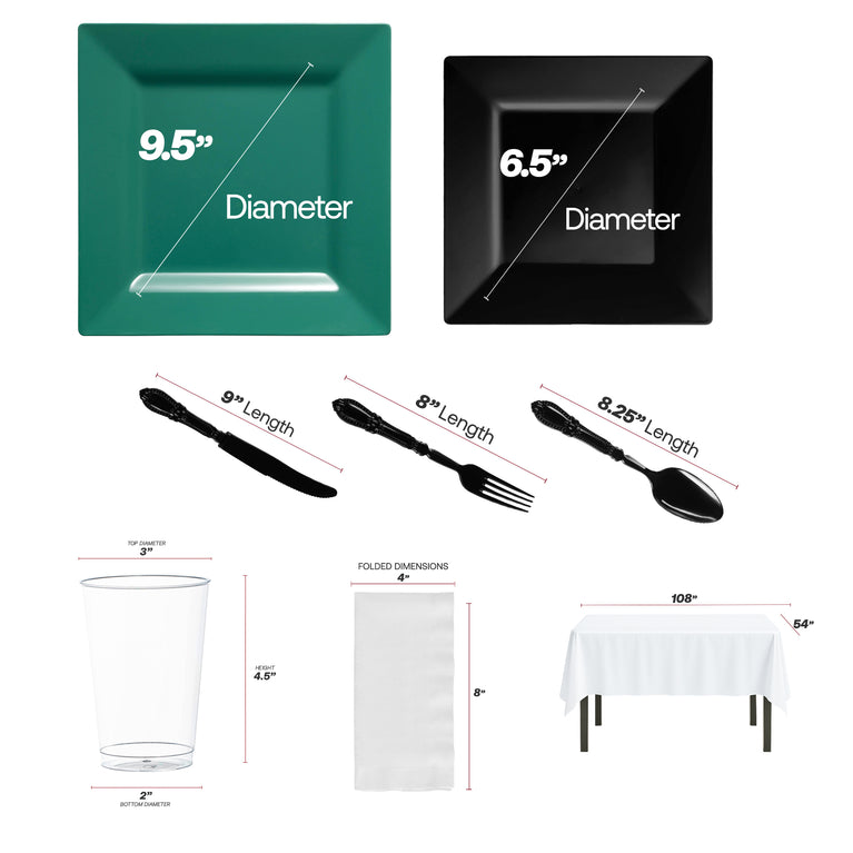- Service for 20: 20 Dinner Plates, 20 Cake Plates, 20 Forks, 20 Spoons, 20 Knives, 4 Tablecloths, 50 Dinner Napkins and 20 Cups