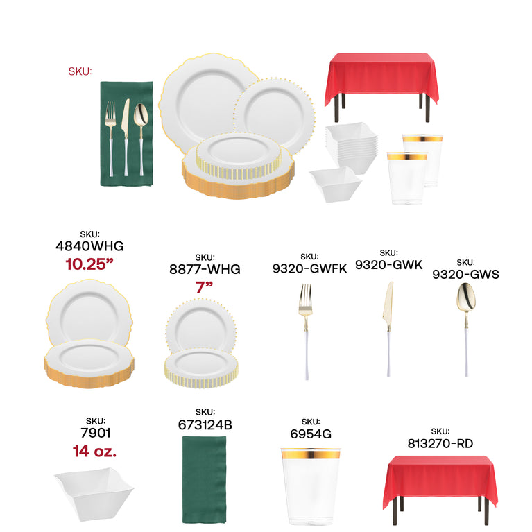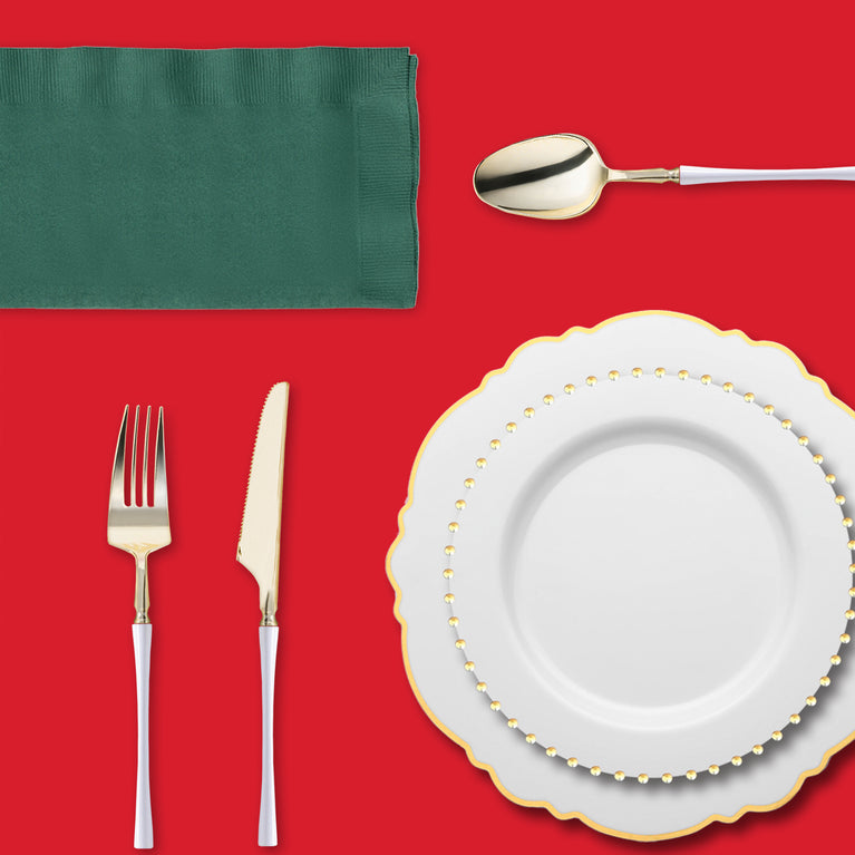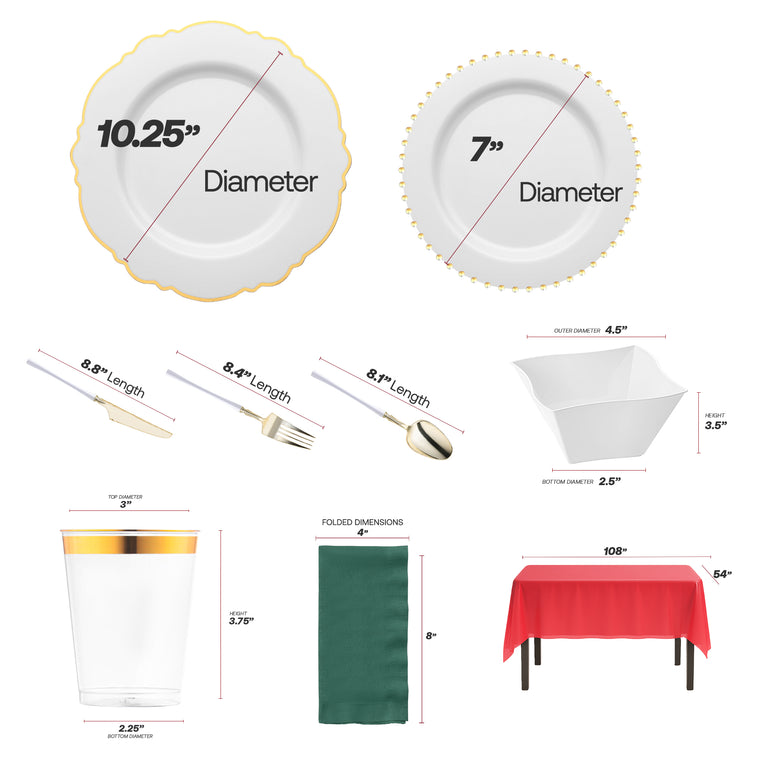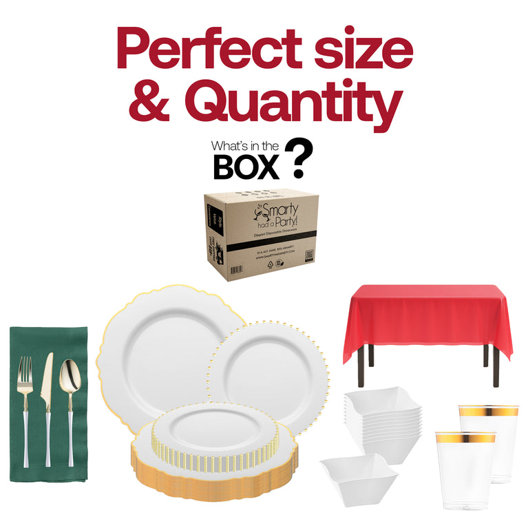 - Service for 20: 20 Dinner Plates, 20 Salad Plates, 20 Soup Bowls, 20 Forks, 20 Spoons, 20 Knives, 4 Tablecloths, 50 Dinner Napkins and 20 Tumblers
