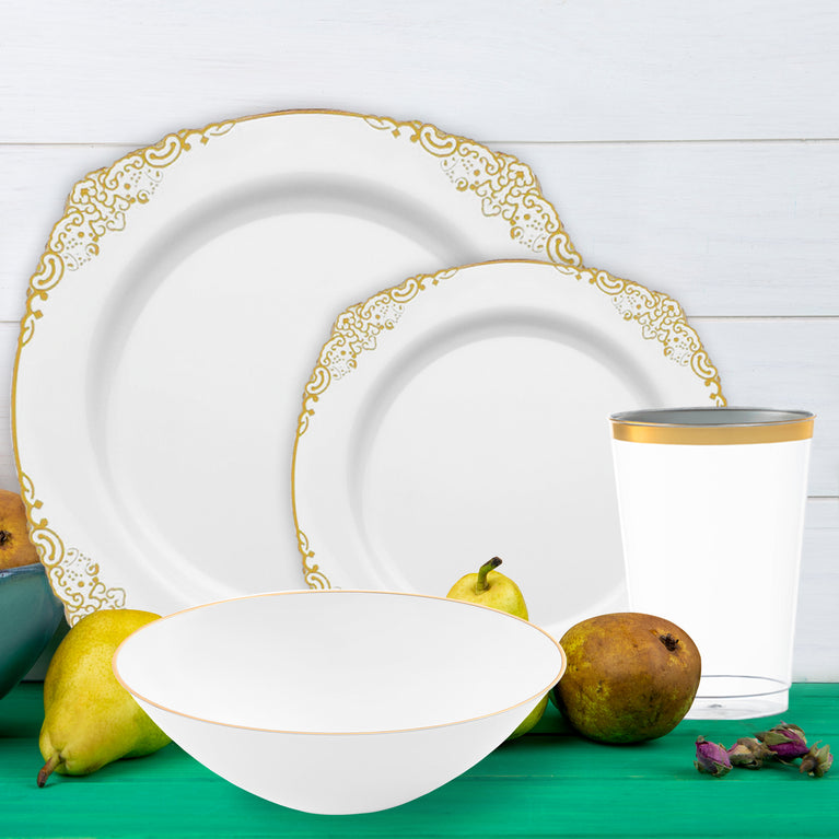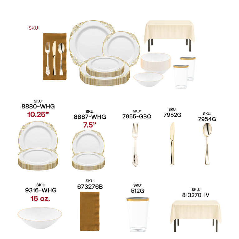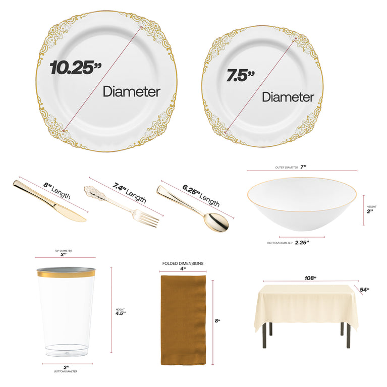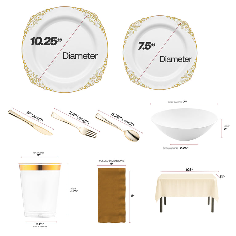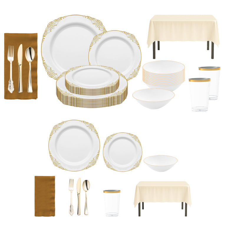 - Service for 60: 60 Dinner Plates, 60 Salad Plates, 60 Soup Bowls, 60 Forks, 60 Spoons, 60 Knives, 8 Tablecloths, 100 Dinner Napkins and 60 Tumblers