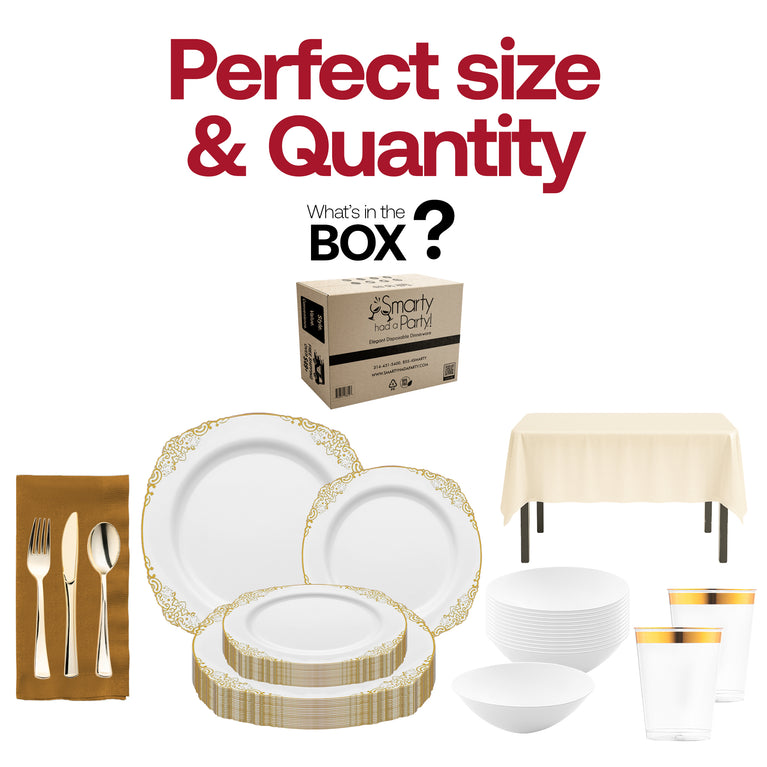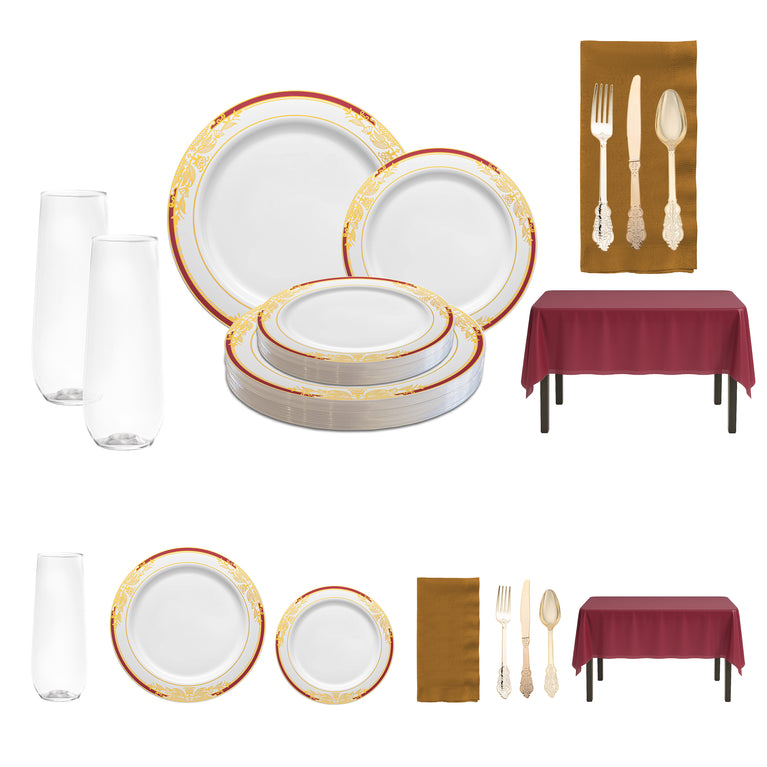 - Service for 20: 20 Dinner Plates, 20 Salad Plates, 20 Soup Bowls, 20 Forks, 20 Spoons, 20 Knives, 4 Tablecloths, 50 Dinner Napkins and 20 Tumblers