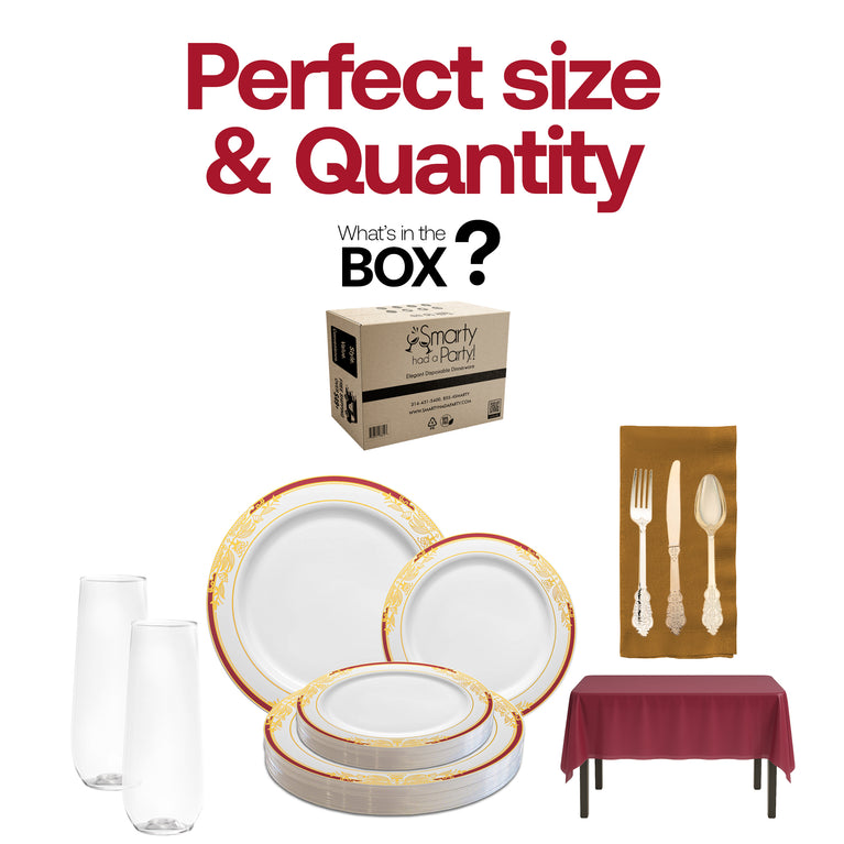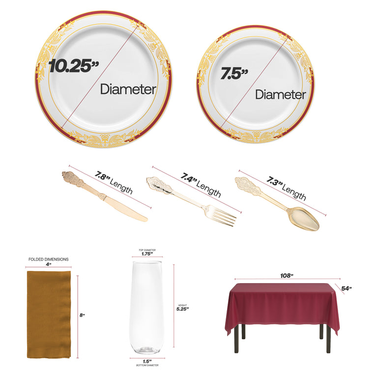 - Service for 20: 20 Dinner Plates, 20 Salad Plates, 20 Forks, 20 Spoons, 20 Knives, 4 Tablecloths, 50 Dinner Napkins and 20 Champagne Flutes
