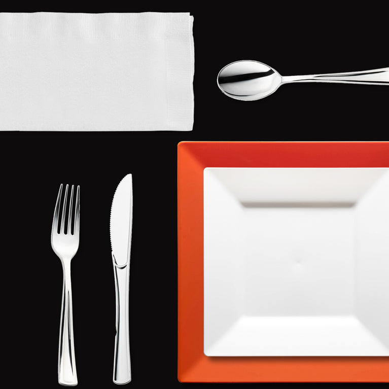 - Service for 20: 20 Dinner Plates, 20 Cake Plates, 20 Forks, 20 Spoons, 20 Knives, 4 Tablecloths, 50 Dinner Napkins and 20 Tumblers