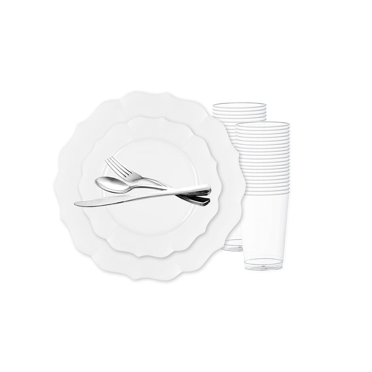 - Service for 20: 20 Dinner plates, 20 salad plates, 20 forks, 20 spoons, 20 knives and 20 12 oz. Tumblers