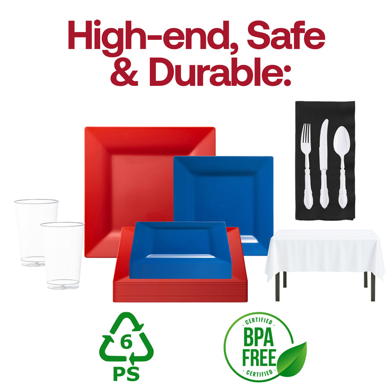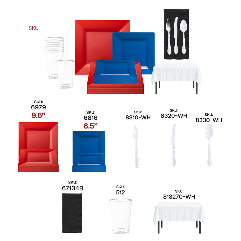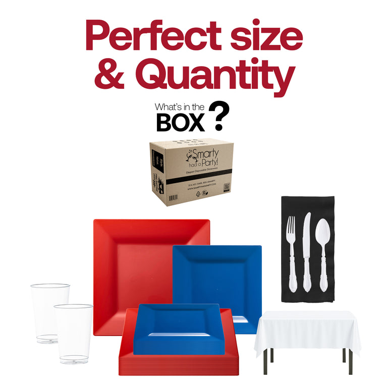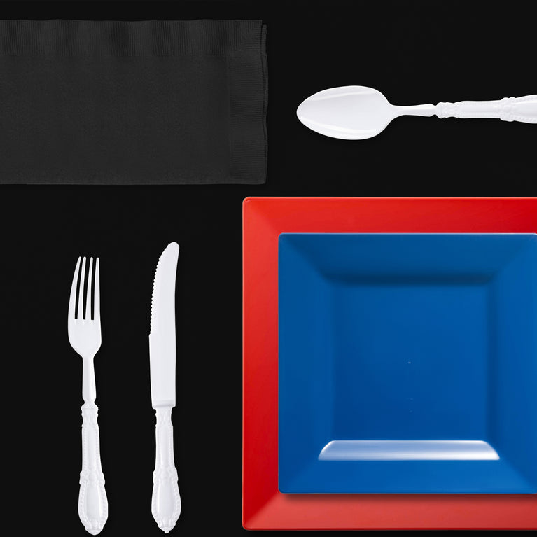 - Service for 20: 20 Dinner Plates, 20 Cake Plates, 20 Forks, 20 Spoons, 20 Knives, 4 Tablecloths, 50 Dinner Napkins and 20 Cups