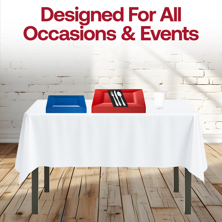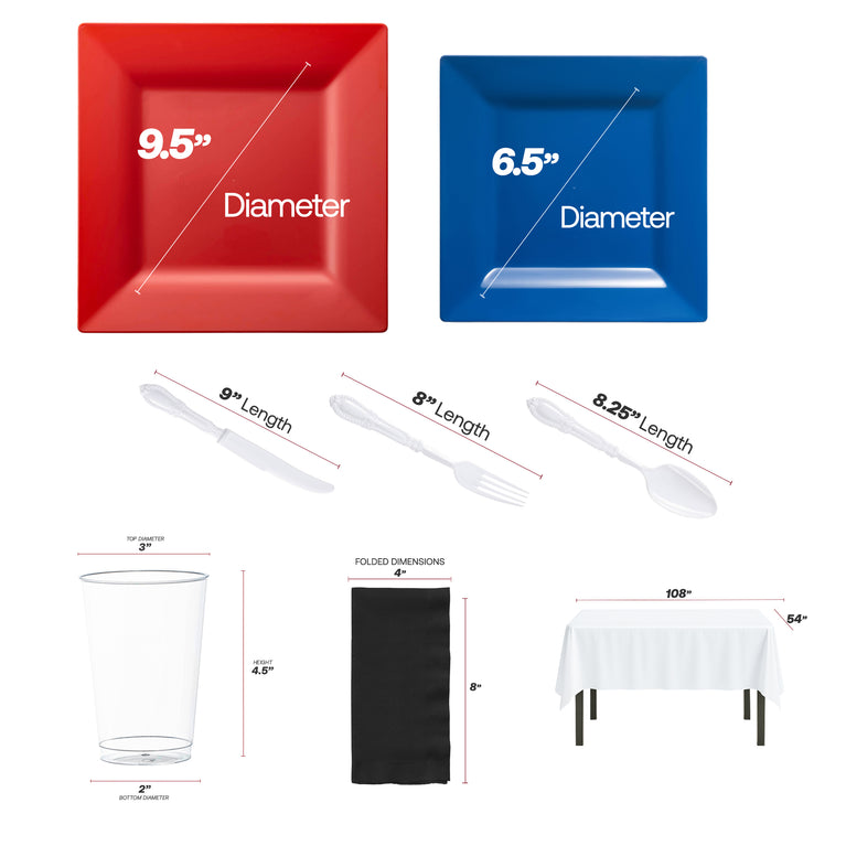 - Service for 60: 60 Dinner Plates, 60 Cake Plates, 60 Forks, 60 Spoons, 60 Knives, 8 Tablecloths, 100 Dinner Napkins and 60 Cups