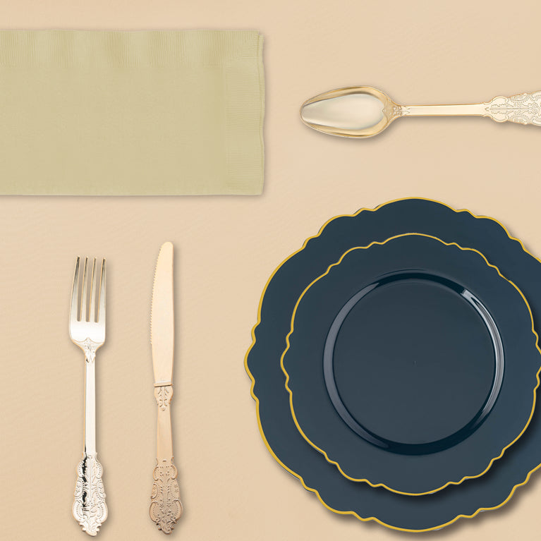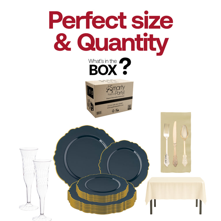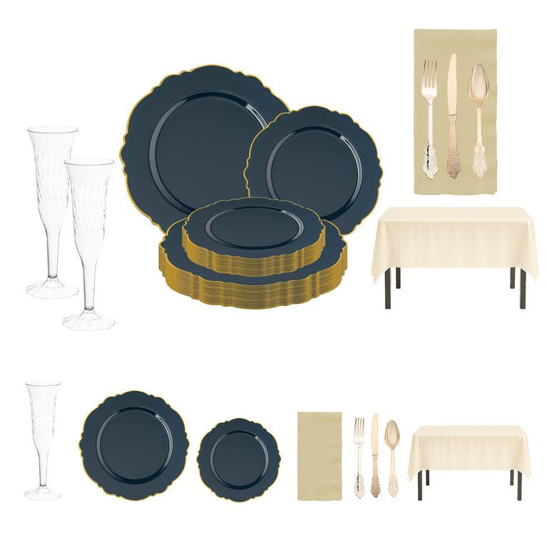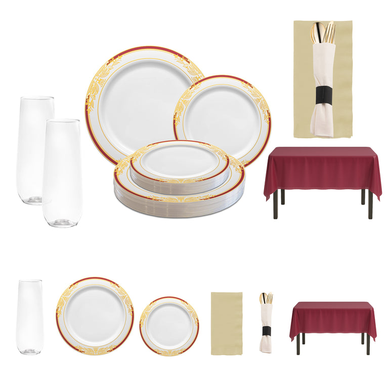 - Service for 20: 20 Dinner Plates, 20 Salad Plates, 20 Forks, 20 Spoons, 20 Knives, 4 Tablecloths, 50 Dinner Napkins and 20 Champagne Flutes