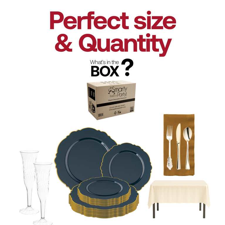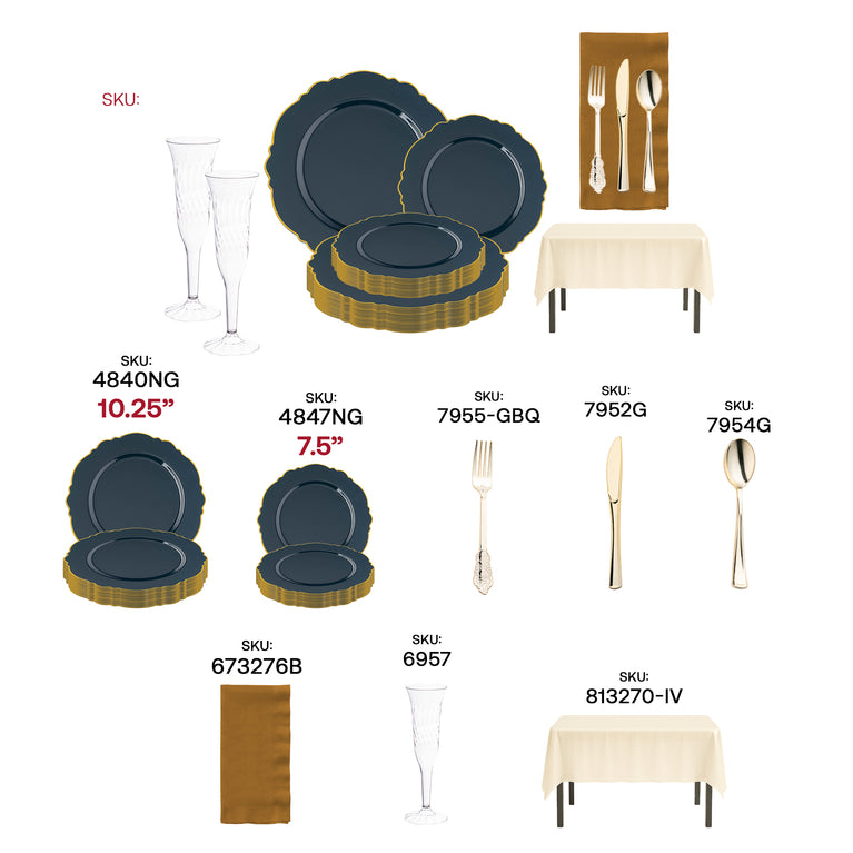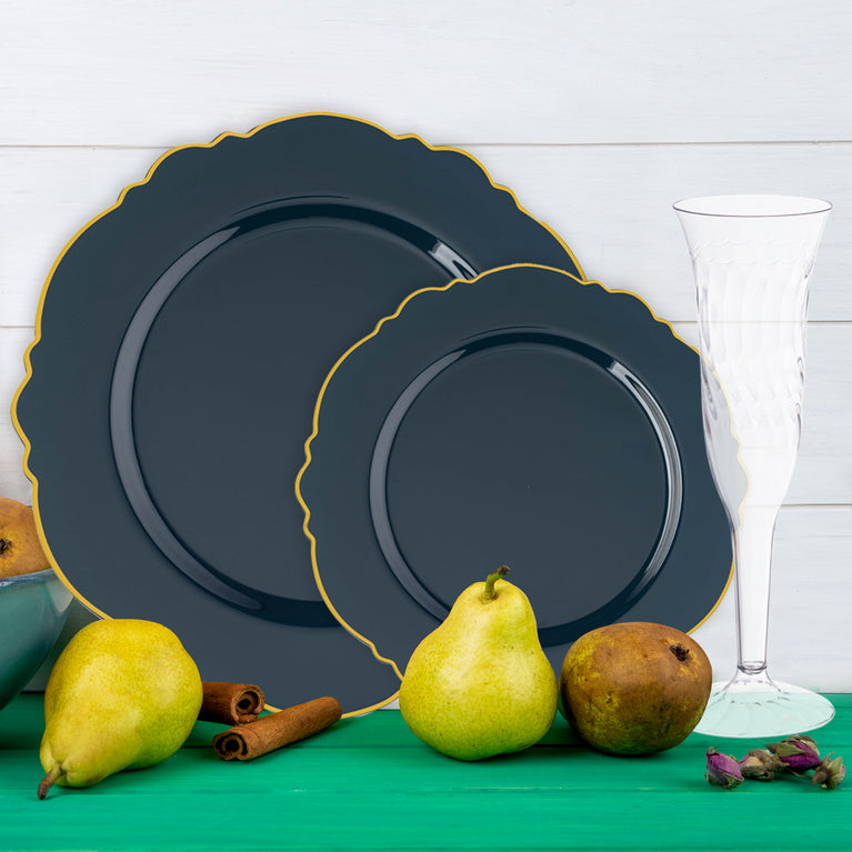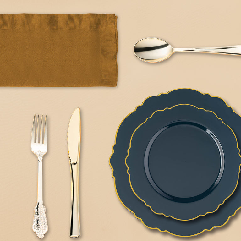 - Dinner Plates: Navy with Gold