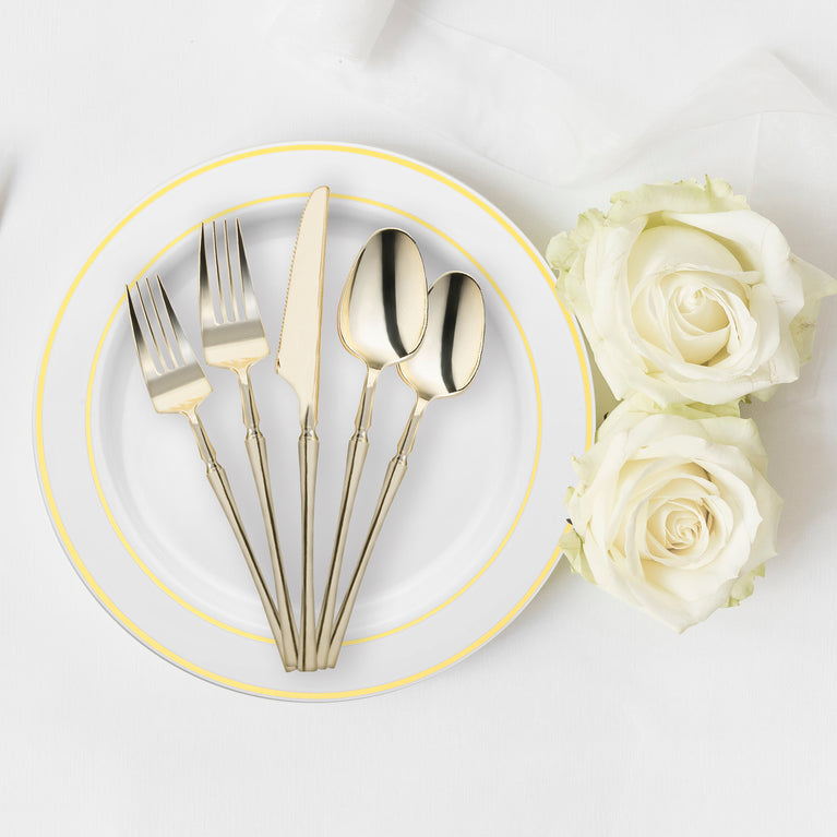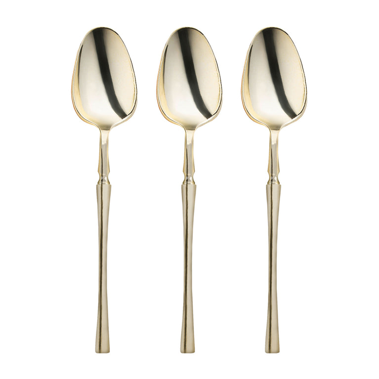 Modern Shiny Gold Dinner Spoons You have chosen every element of your wedding reception, birthday party, baby shower, bridal bash, holiday feast, or professionally catered event with care, from the matching dinnerware to the stunning tablecloths, centerpieces, and more - now, you need cutlery that looks just as good as the rest of the details you have chosen while complementing the classy impression you have tried so hard to create. In that case, these premium disposable plastic dinner spoons, sprucing...