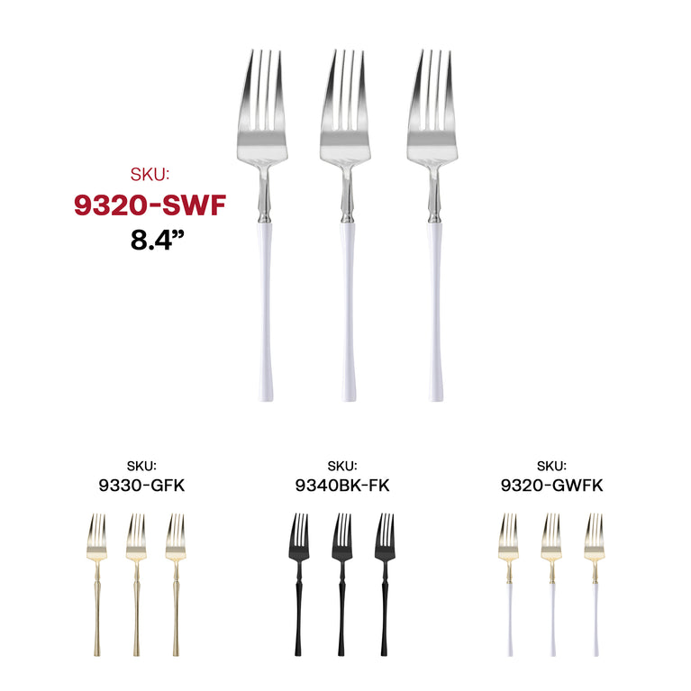 If you're looking for high-quality disposable partyware and silverware that adds an air of sophistication and elegance, then these fabulous dinner forks are for you. Silver with White Handle Moderno Dinner Forks are made from top-quality plastic materials. These exquisite dinner forks are built with handles that won't wimp out, making them strong, sturdy, and reliable. Non-toxic, BPA-free, extra-durable plastic construction prevents them from sagging or breaking from food, giving your table the most elegant and luxurious look at an affordable price. Plus, these premium plastic dinner forks are conveniently disposable and fully recyclable, simplifying the cleaning process when the party is over. Make your event clean-up simple and quick with these amazing disposable forks - just toss them in the garbage and walk away as a guest. Our exquisite dinner forks stand out and impressively catch the eye of guests. These are very safe and convenient to use. These dinner forks will definitely give your event an elegant touch without distracting you from your event. Save these to your favorites - you're going to love them and want to come back for more.