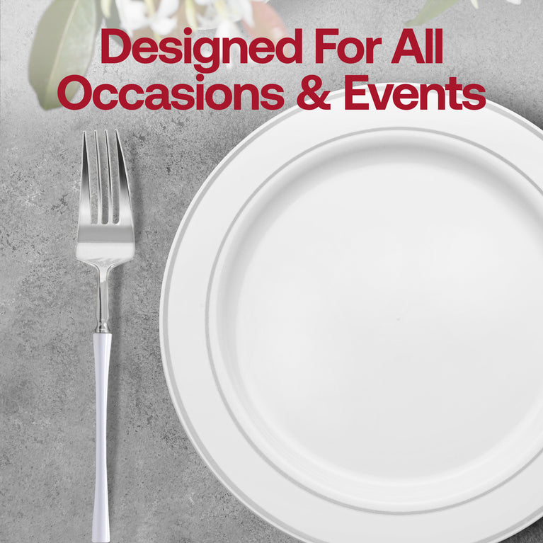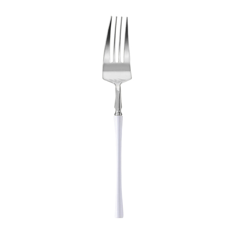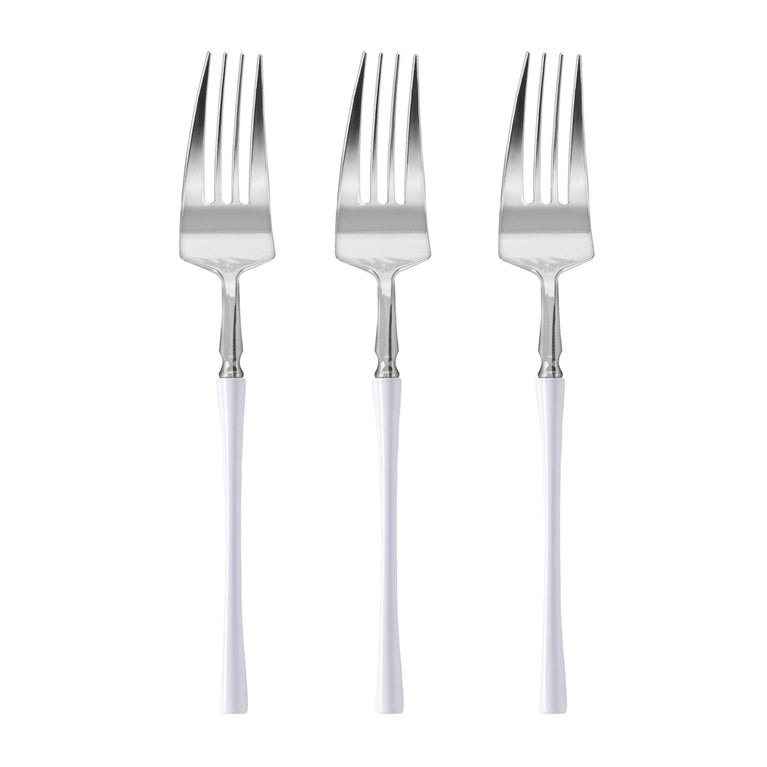 Serve your guests in true style with these modern disposable plastic dinner forks. These premium Plastic Dinner Forks boast a shiny silver design and stylish white handles that coordinate with any dinnerware set. Versatile enough for traditional or contemporary entertaining, these beautiful plastic forks are the perfect addition to your next birthday party, baby shower, wedding reception, holiday feast, banquet, bridal bash, or any other fancy catered event.