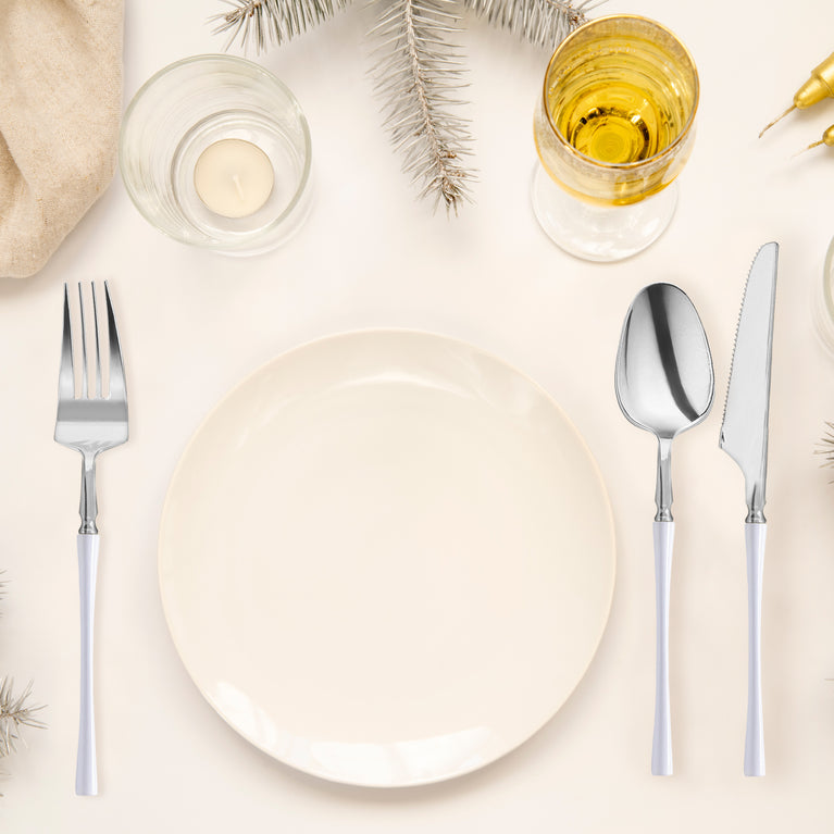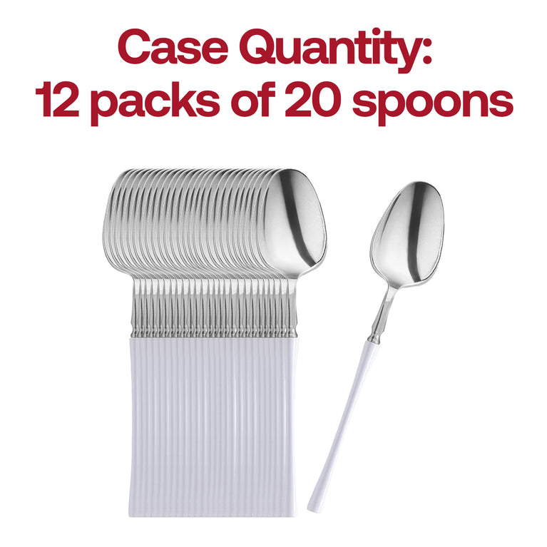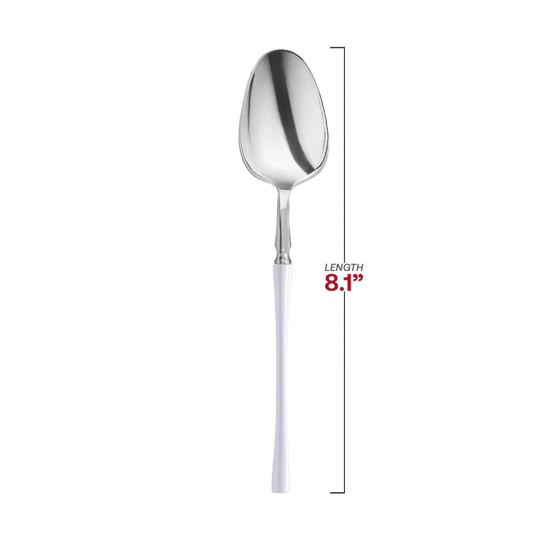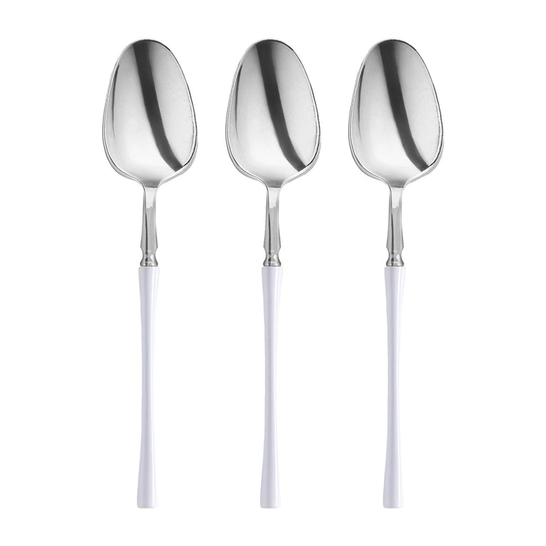 Ultra-Durable Modern Plastic Silverware Treat your guests to a luxurious dining experience! Our heavy-duty silver disposable plastic spoon is the classiest addition to making a dining table décor look outright classy and noble. The premium plastic silver spoons are made using ultra-durable plastic materials yet with the captivating original silverware appeal. Featuring a luxurious shiny metallic silver finish complimented with modern white handles, these lovely disposable spoons will heighten the level of sophistication of your table setting. Neither too visually...