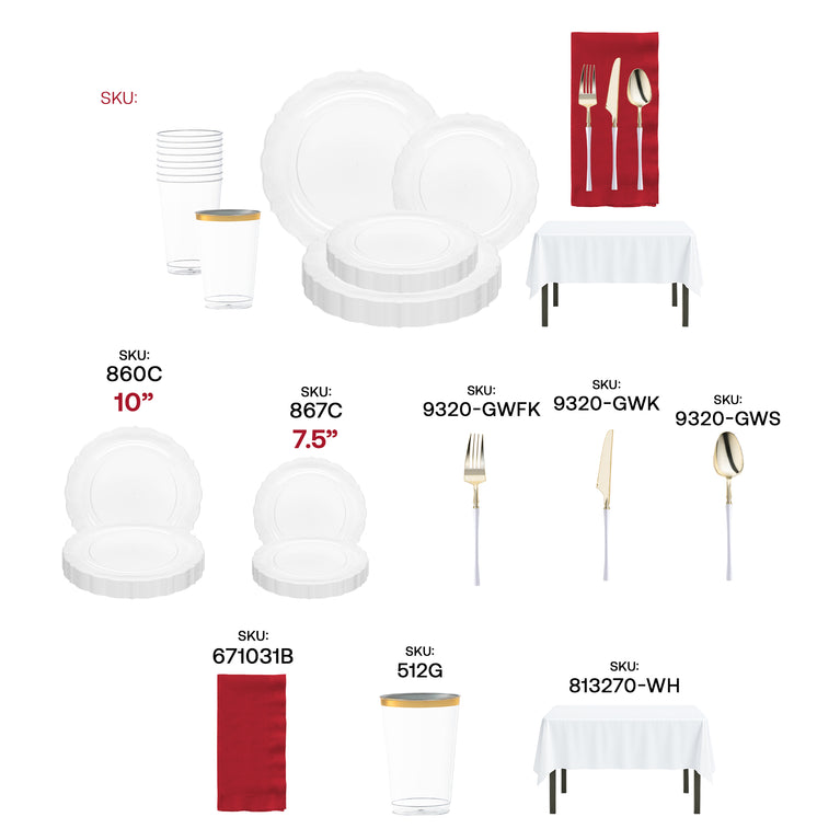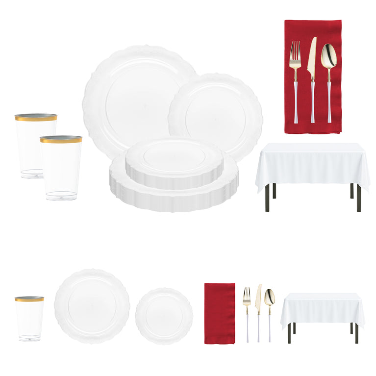 - Service for 20: 20 Dinner Plates, 20 Salad Plates, 20 Forks, 20 Spoons, 20 Knives, 4 Tablecloths, 50 Dinner Napkins and 20 Tumblers