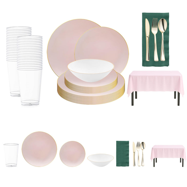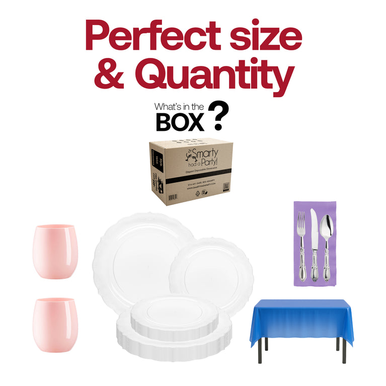 - Service for 60: 60 Dinner Plates, 60 Salad Plates, 60 Forks, 60 Spoons, 60 Knives, 8 Tablecloths, 100 Dinner Napkins and 60 Wine Glasses