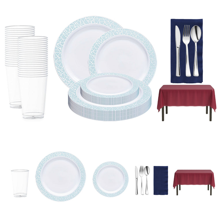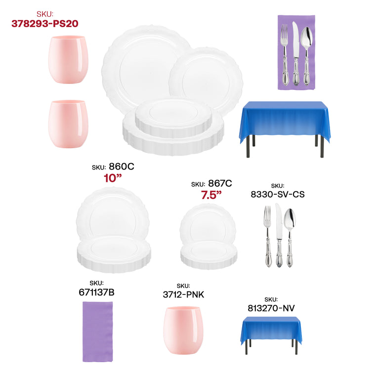 - Service for 20: 20 Dinner Plates, 20 Salad Plates, 20 Forks, 20 Spoons, 20 Knives, 4 Tablecloths, 50 Dinner Napkins and 20 Wine Glasses