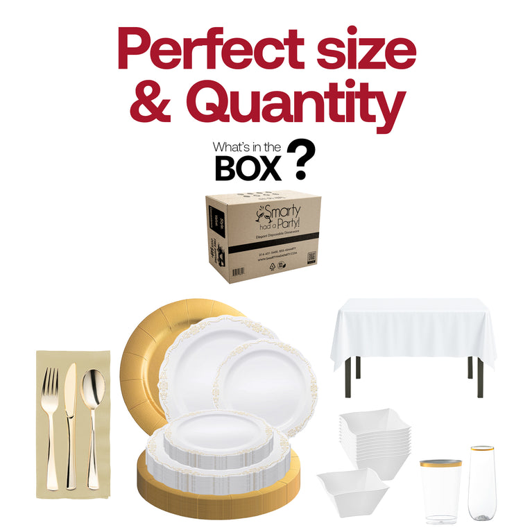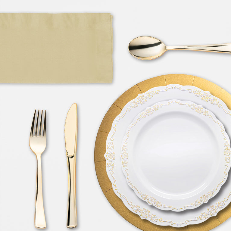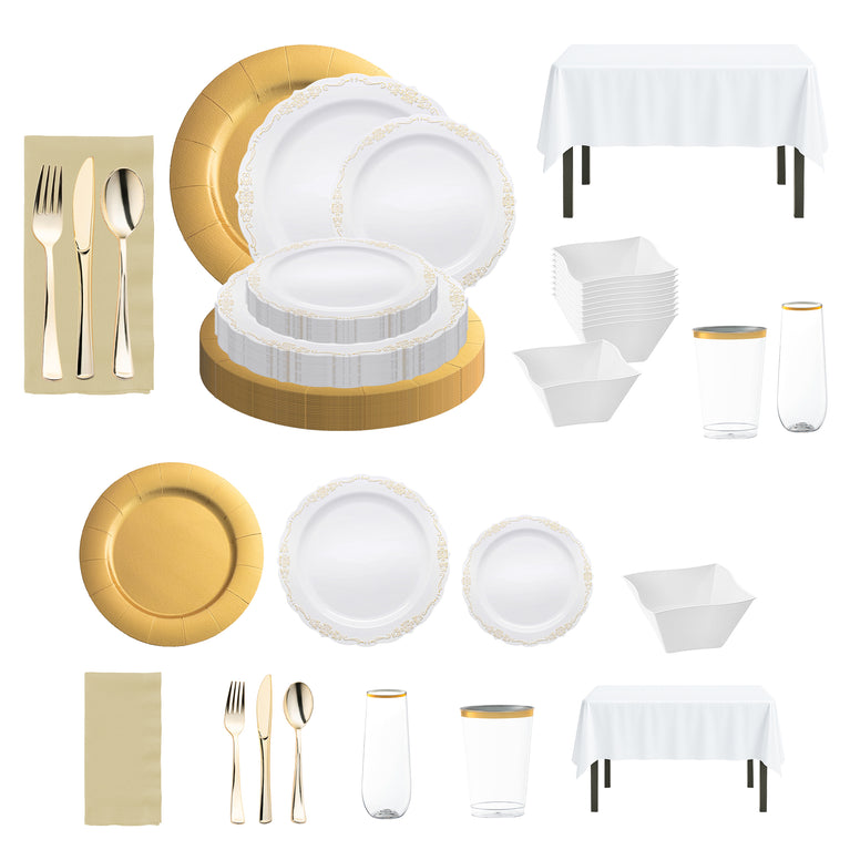 - Service for 50: 50 Charger Plates, 50 Dinner Plates, 50 Salad Plates, 50 Soup Bowls, 50 Forks, 50 Spoons, 50 Knives, 6 Tablecloths, 50 Dinner Napkins, 50 Tumblers, 50 Champagne Flutes