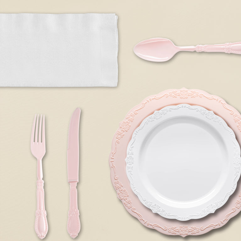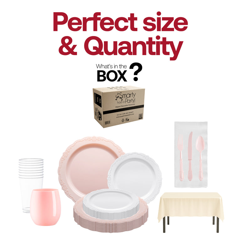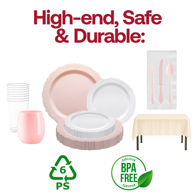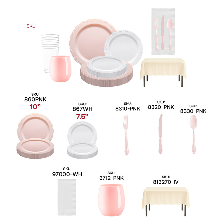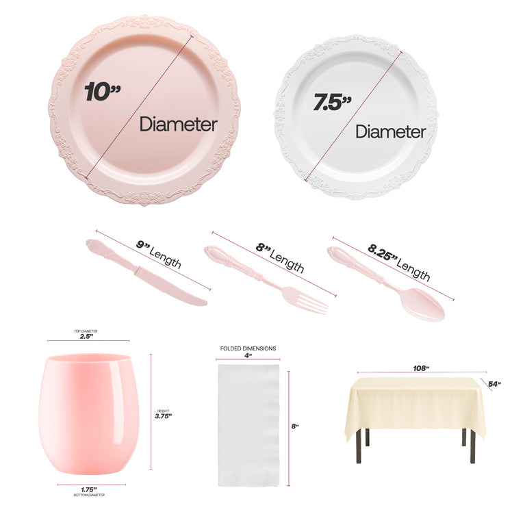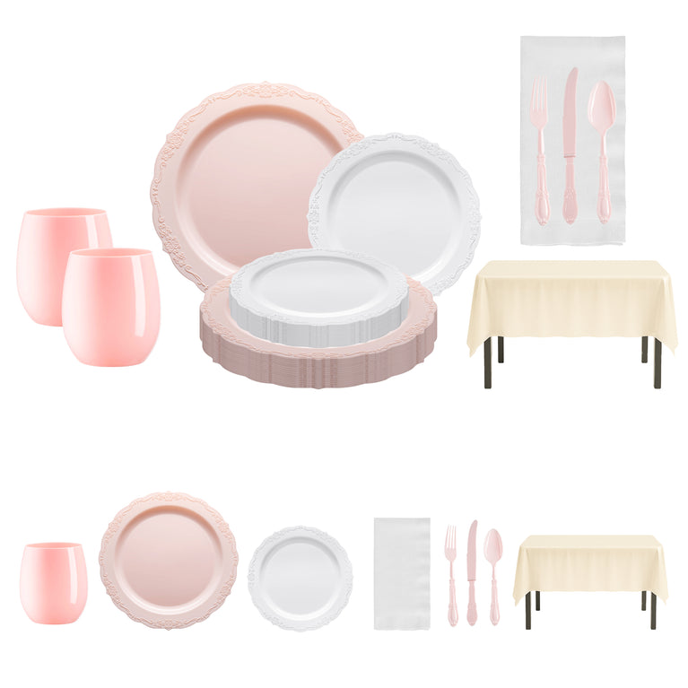 - Service for 60: 60 Dinner Plates, 60 Salad Plates, 60 Forks, 60 Spoons, 60 Knives, 8 Tablecloths, 100 Dinner Napkins and 60 Wine Glasses