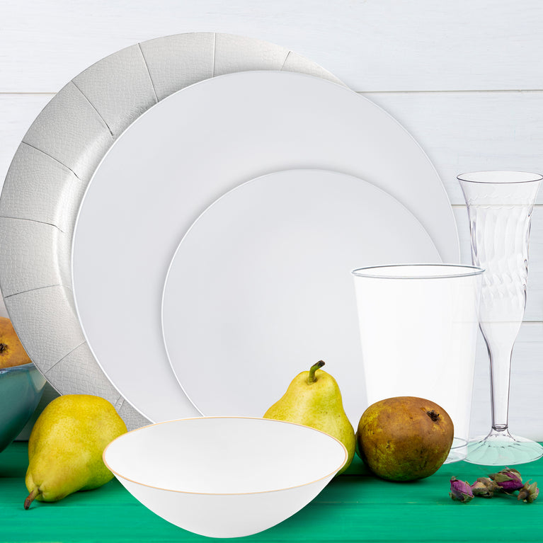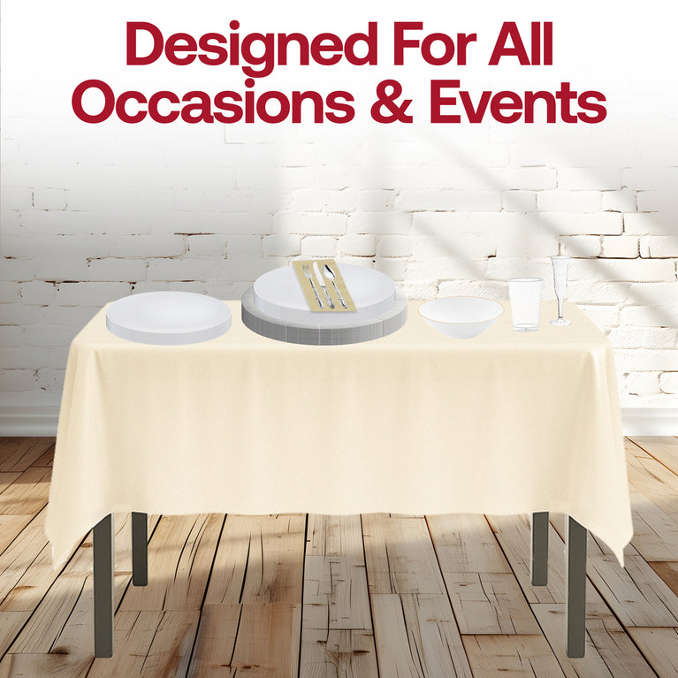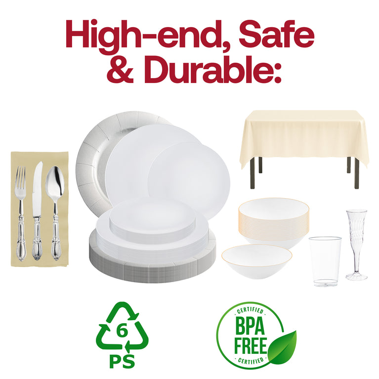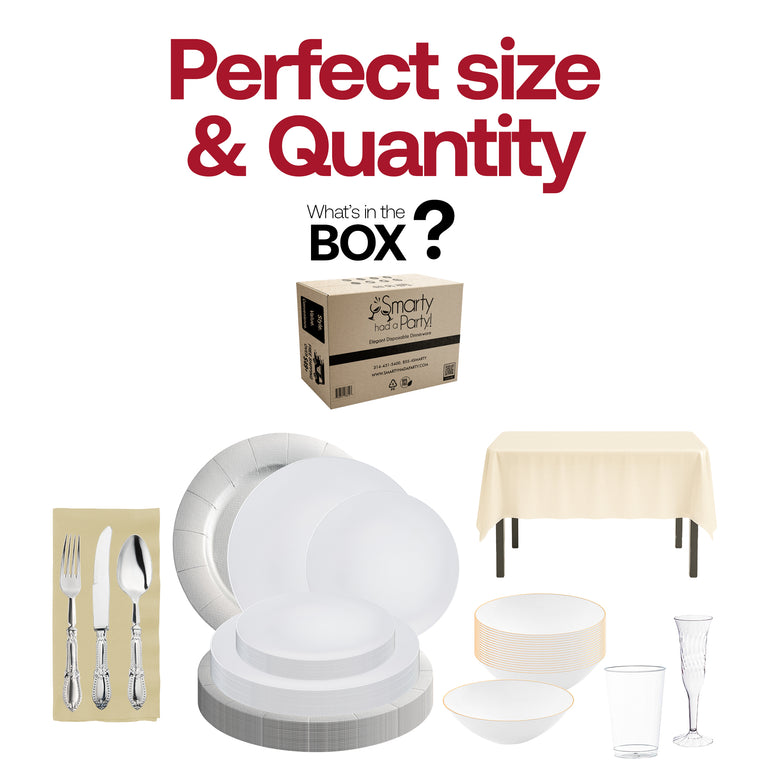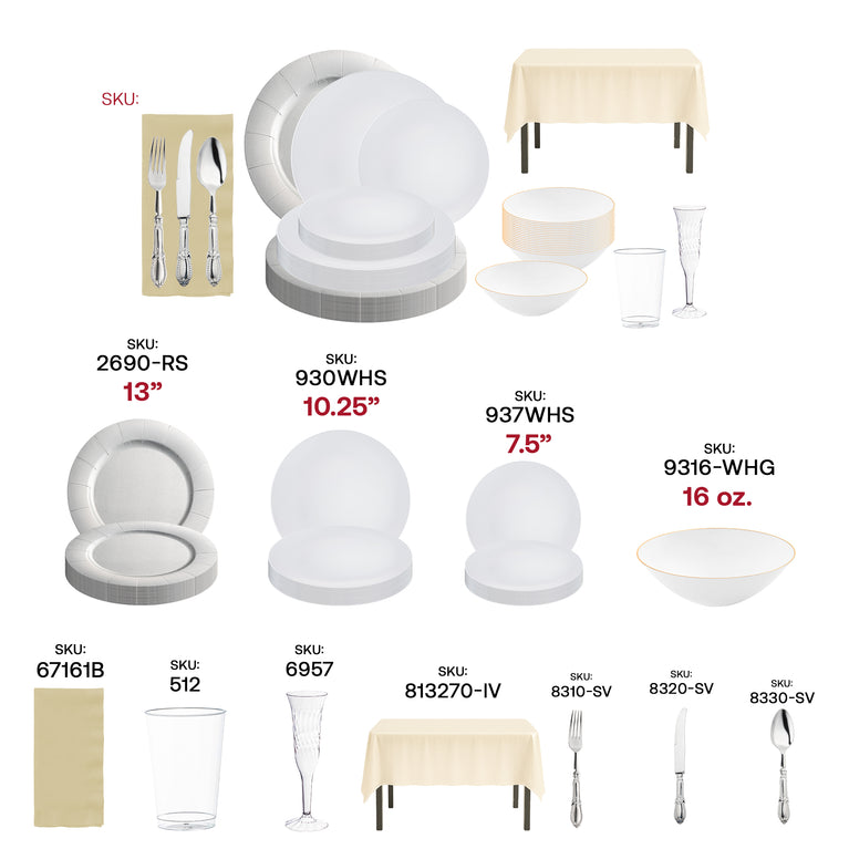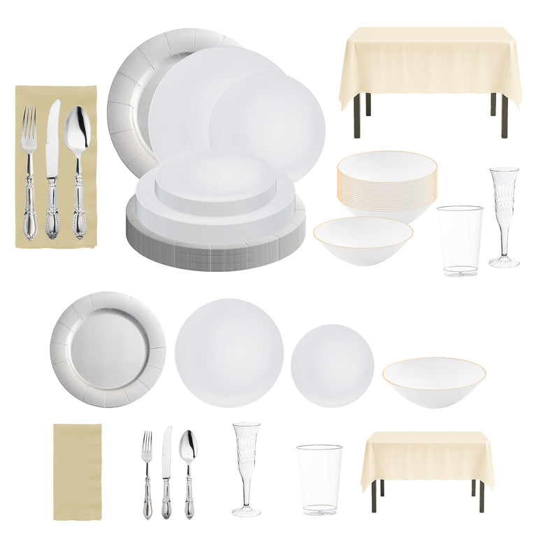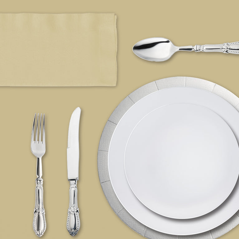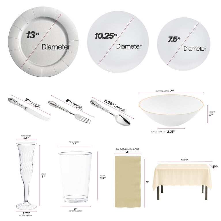 - Service for 50: 50 Charger Plates, 50 Dinner Plates, 50 Salad Plates, 50 Soup Bowls, 50 Forks, 50 Spoons, 50 Knives, 6 Tablecloths, 50 Dinner Napkins, 50 Cups, 50 Champagne Flutes