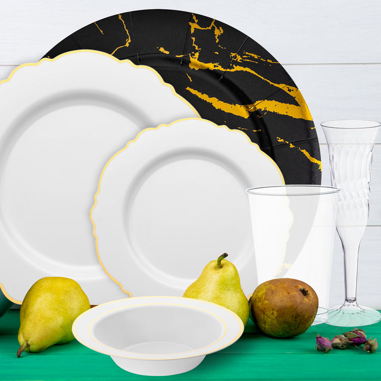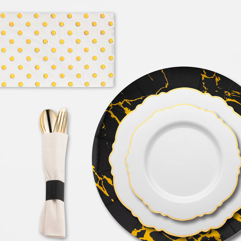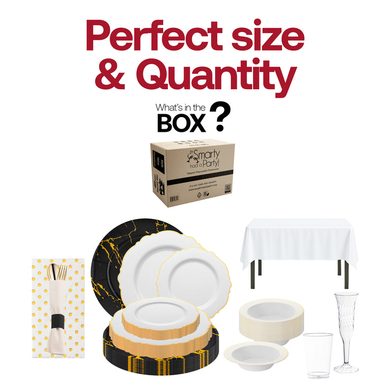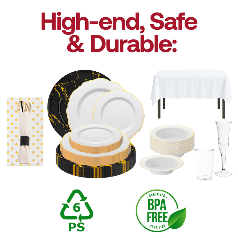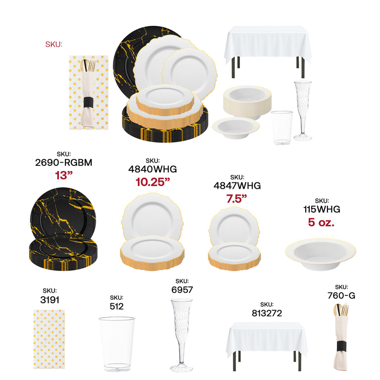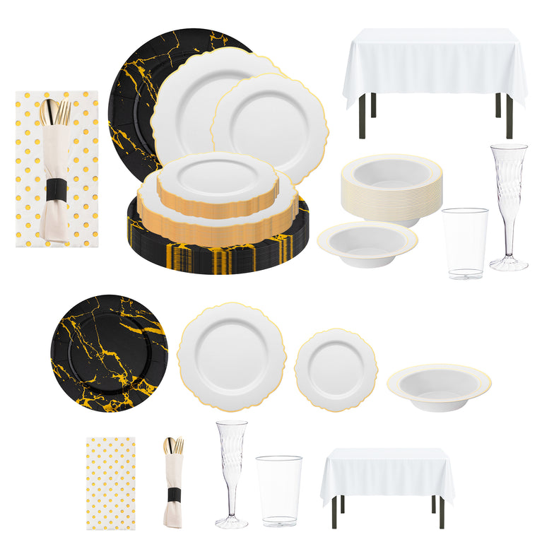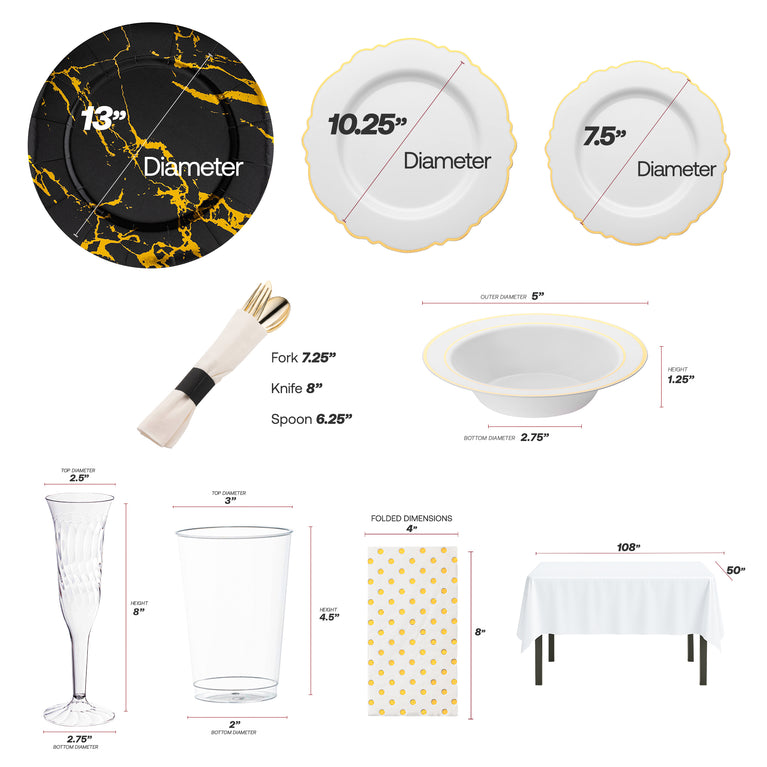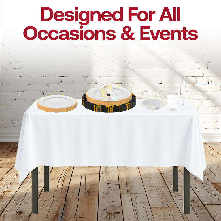 - Service for 50: 50 Charger Plates, 50 Dinner Plates, 50 Salad Plates, 50 Dessert Bowls, 50 Forks, 50 Spoons, 50 Knives, 6 Tablecloths, 50 Dinner Napkins, 50 Cups, 50 Champagne Flutes