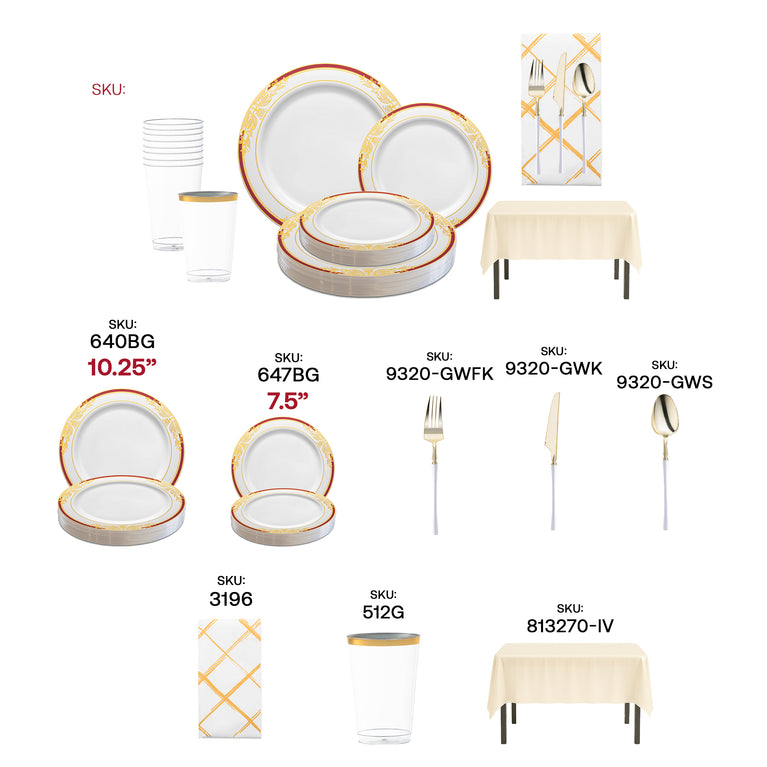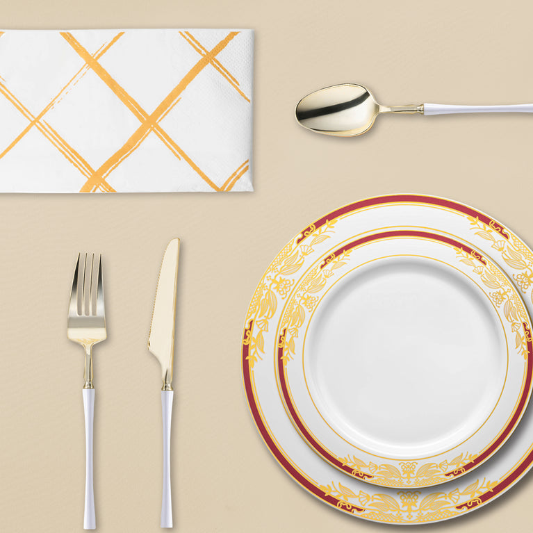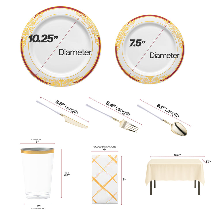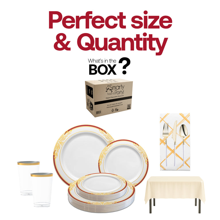 - Service for 20: 20 Dinner Plates, 20 Salad Plates, 20 Forks, 20 Spoons, 20 Knives, 4 Tablecloths, 50 Dinner Napkins and 20 Tumblers