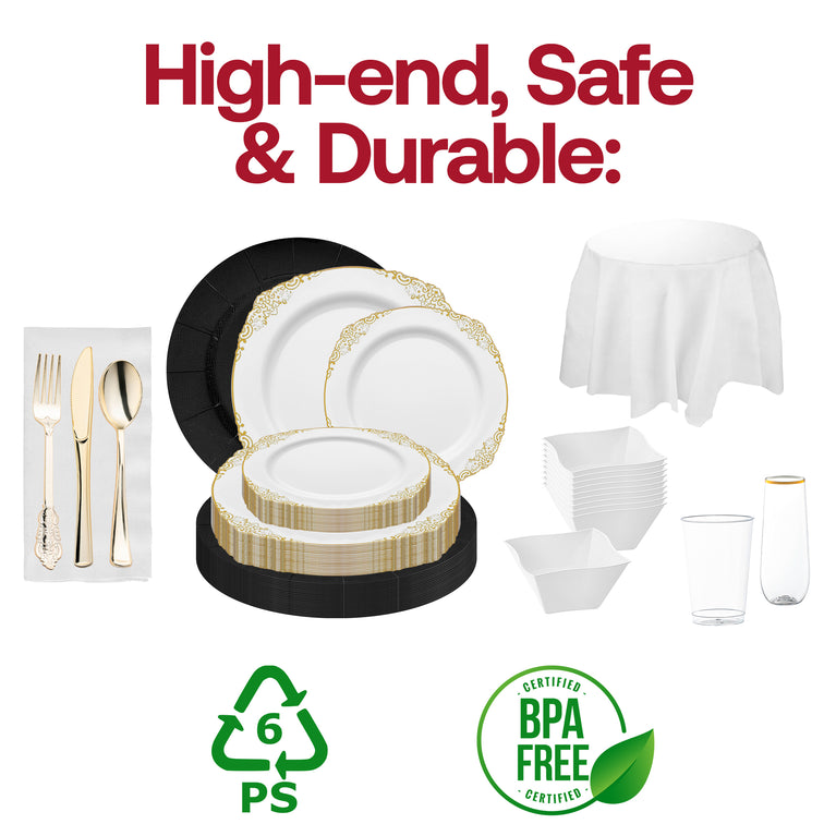 - Service for 50: 50 Charger Plates, 50 Dinner Plates, 50 Salad Plates, 50 Soup Bowls, 50 Forks, 50 Spoons, 50 Knives, 6 Tablecloths, 50 Buffet Napkins, 50 Cups, 50 Champagne Flutes