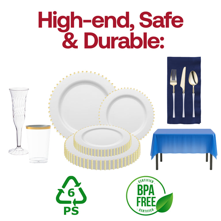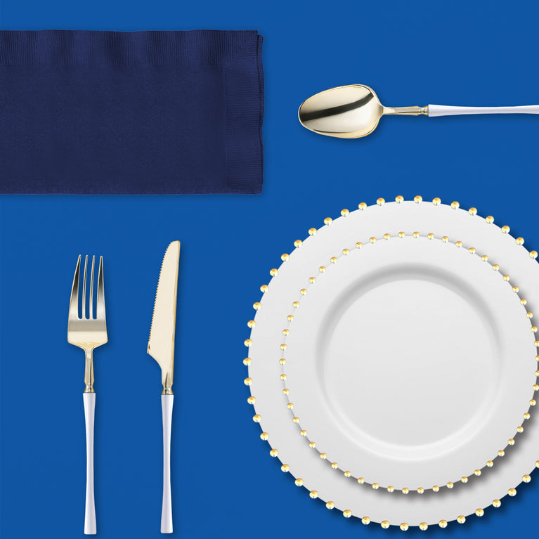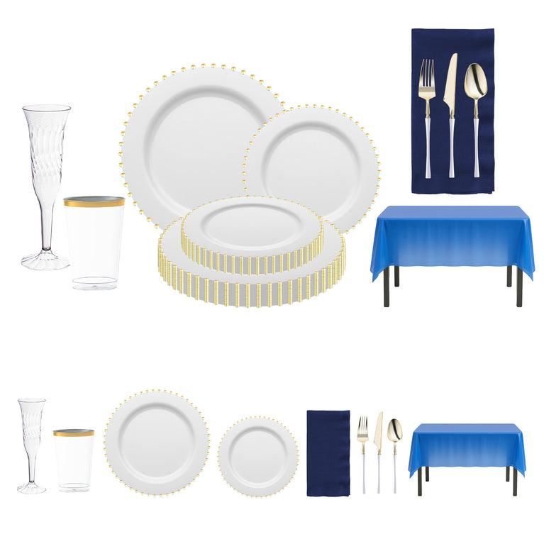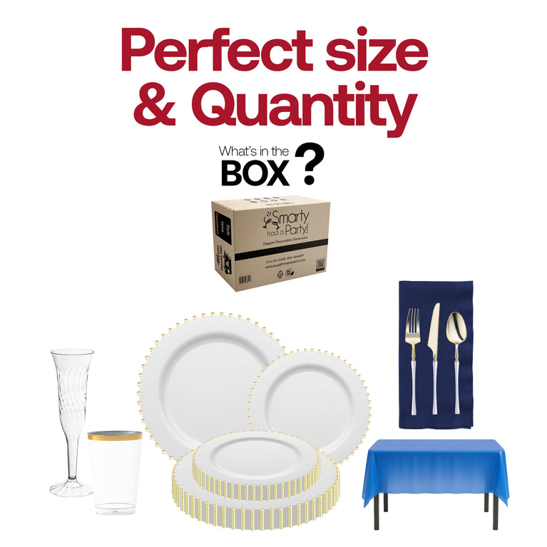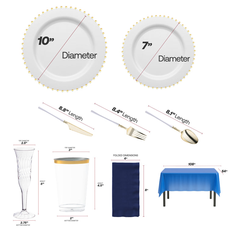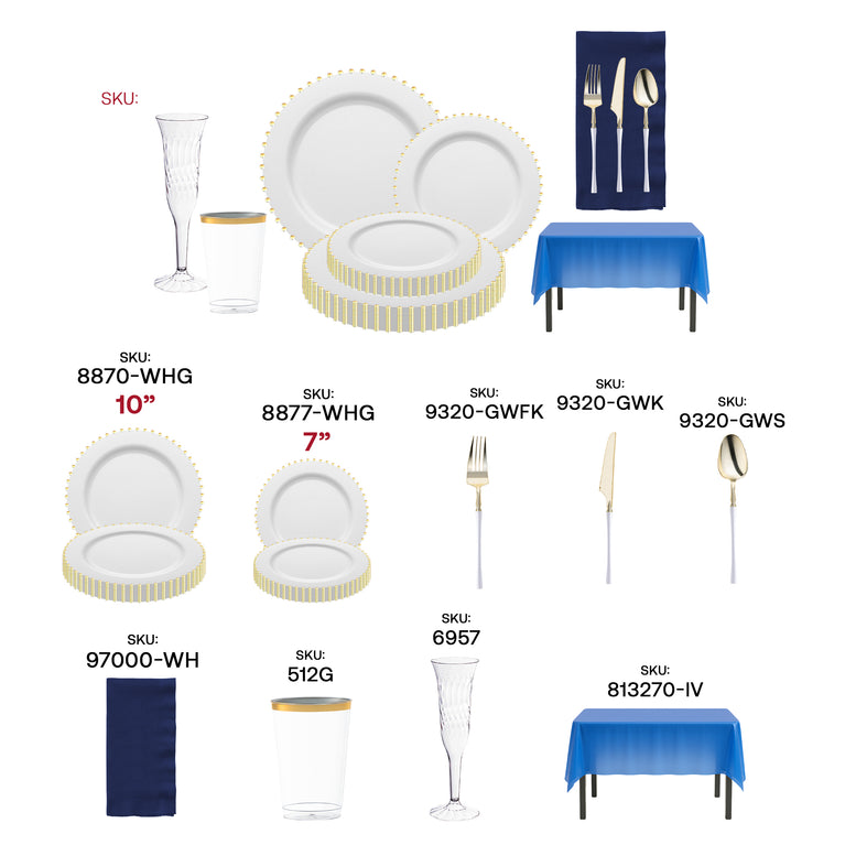 - Service for 50: 50 Dinner Plates, 50 Salad Plates, 50 Forks, 50 Spoons, 50 Knives, 6 Tablecloths, 50 Dinner Napkins, 50 Tumblers, 50 Champagne Flutes