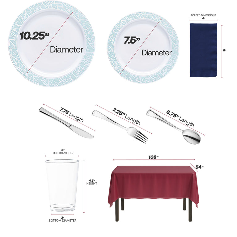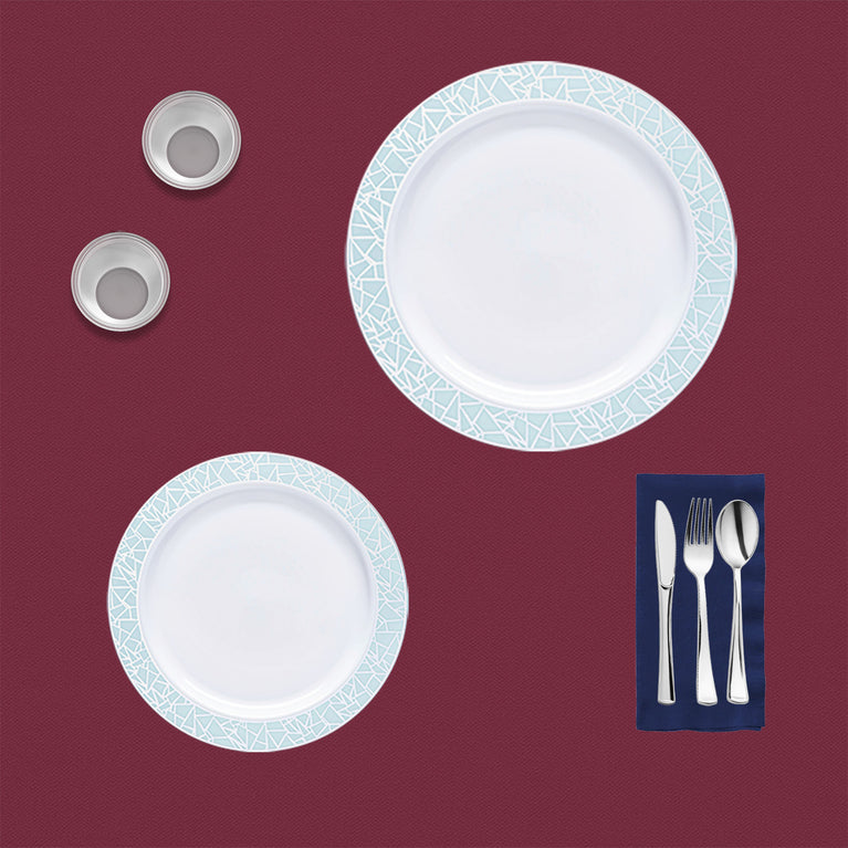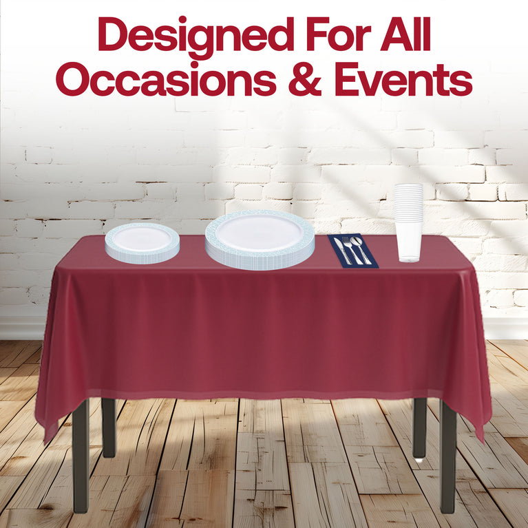 - Service for 60: 60 Dinner Plates, 60 Salad Plates, 60 Forks, 60 Spoons, 60 Knives, 8 Tablecloths, 100 Dinner Napkins and 60 Cups