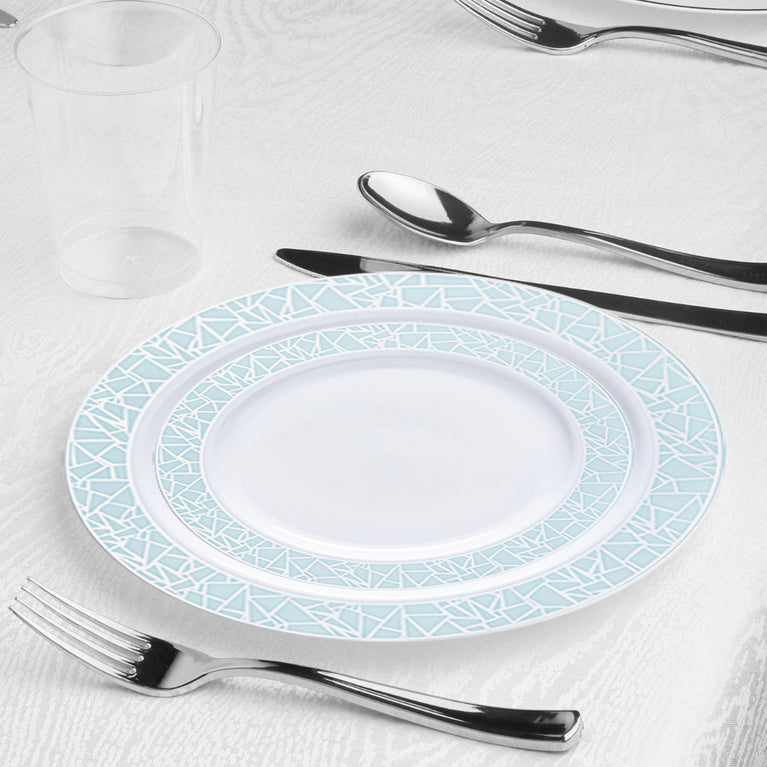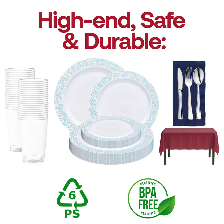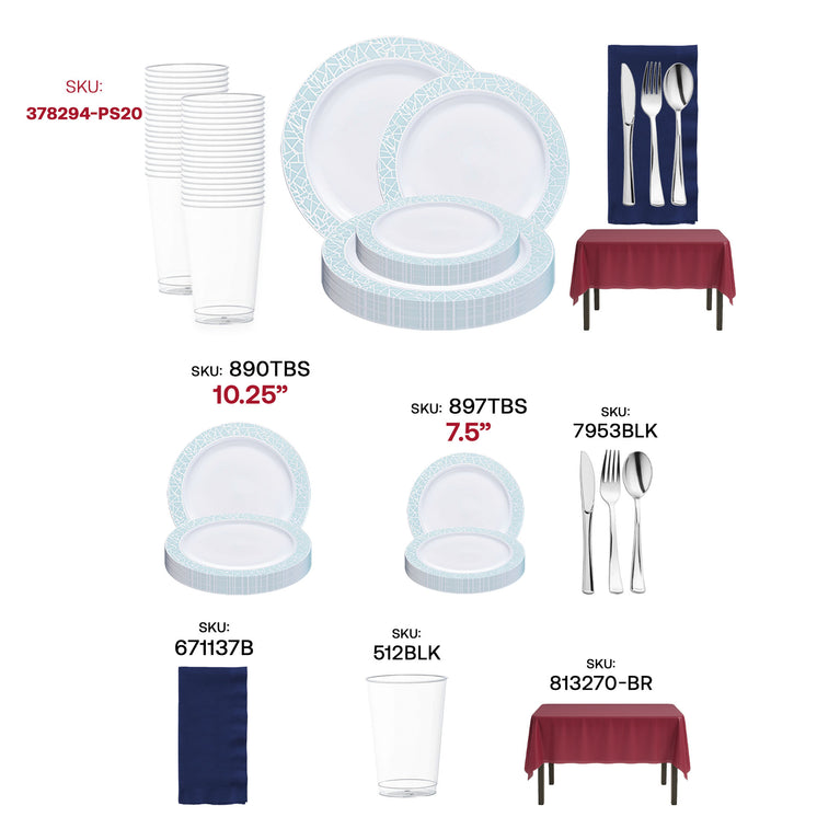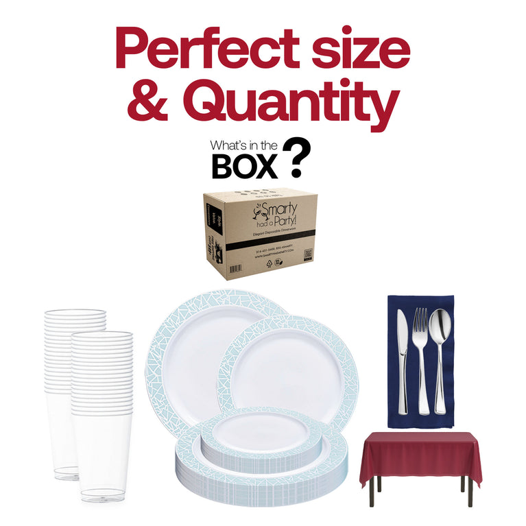 - Service for 20: 20 Dinner Plates, 20 Salad Plates, 20 Forks, 20 Spoons, 20 Knives, 4 Tablecloths, 50 Dinner Napkins and 20 Cups
