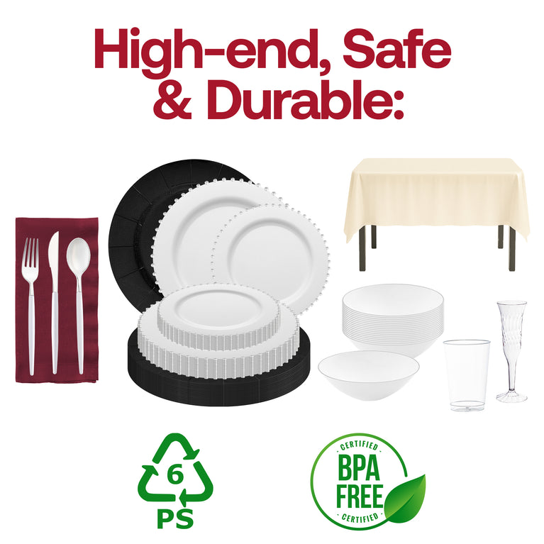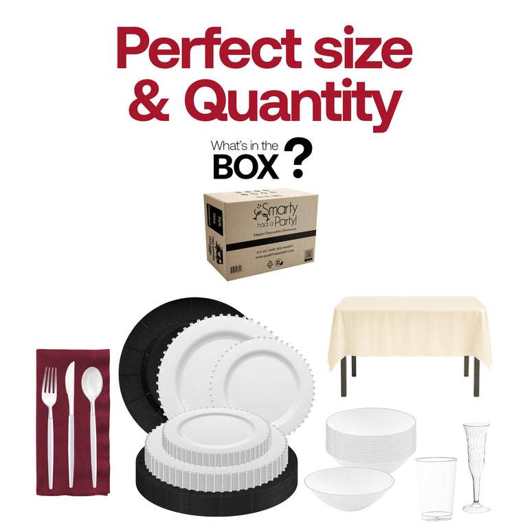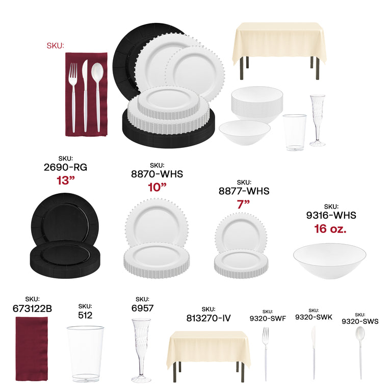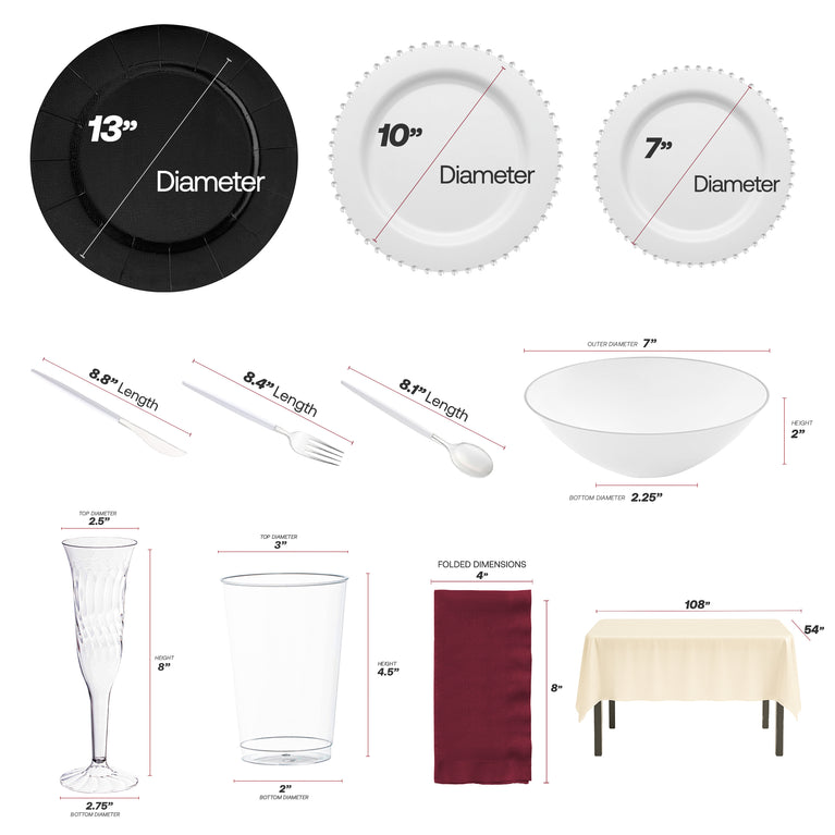 - Service for 50: 50 Charger Plates, 50 Dinner Plates, 50 Salad Plates, 50 Soup Bowls, 50 Forks, 50 Spoons, 50 Knives, 6 Tablecloths, 50 Dinner Napkins, 50 Cups, 50 Champagne Flutes