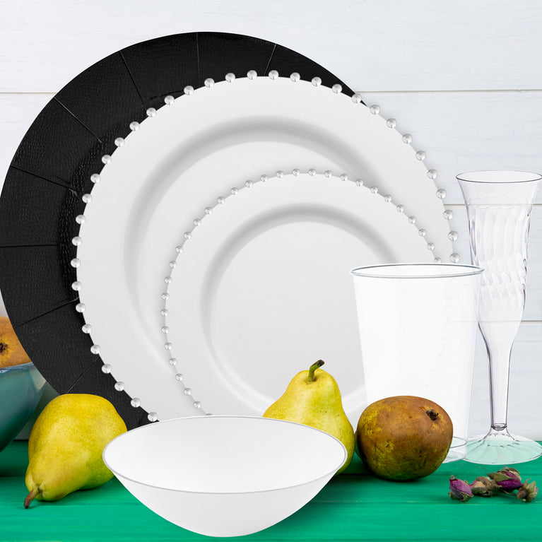 - Dinner Plates: White with Silver