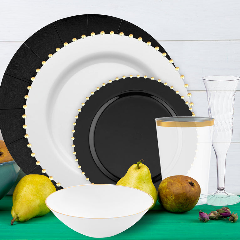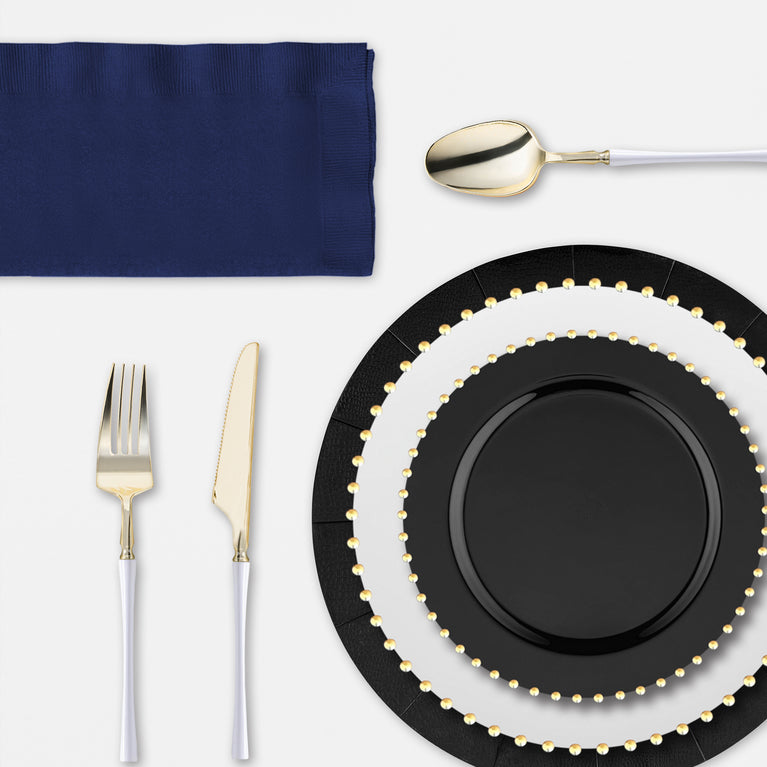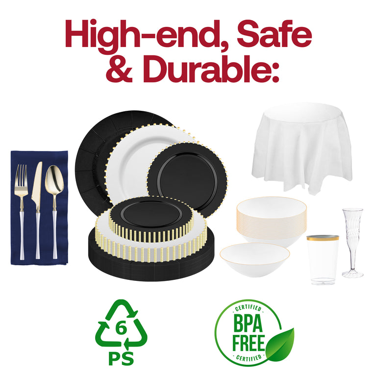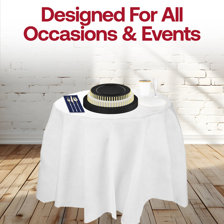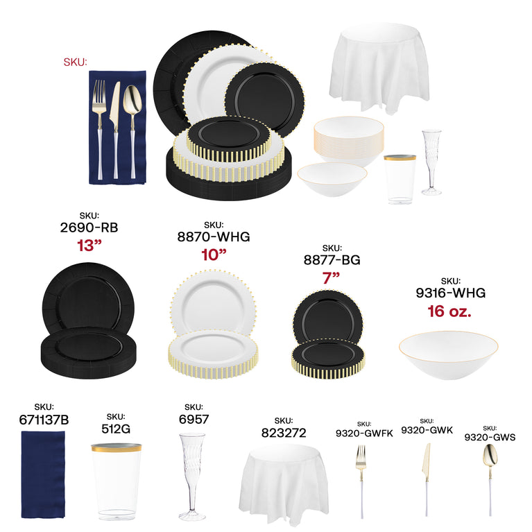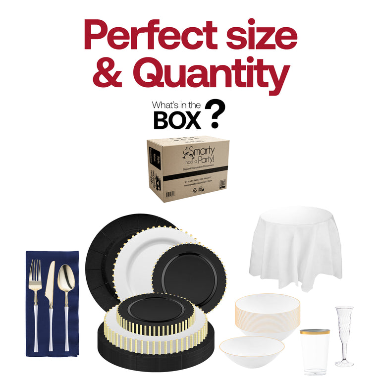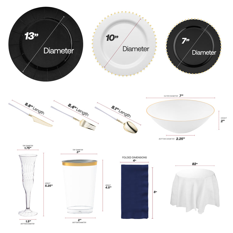 - Service for 50: 50 Charger Plates, 50 Dinner Plates, 50 Salad Plates, 50 Soup Bowls, 50 Forks, 50 Spoons, 50 Knives, 6 Tablecloths, 50 Dinner Napkins, 50 Tumblers, 50 Champagne Flutes