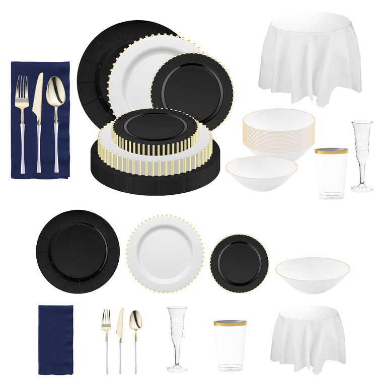 - Service for 100: 100 Charger Plates, 100 Dinner Plates, 100 Salad Plates, 100 Soup Bowls, 100 Forks, 100 Spoons, 100 Knives, 13 Tablecloths, 100 Dinner Napkins, 100 Tumblers, 100 Champagne Flutes
