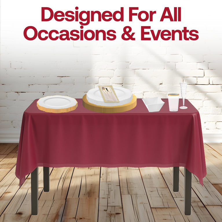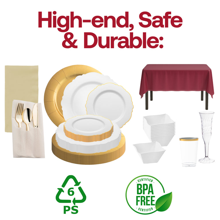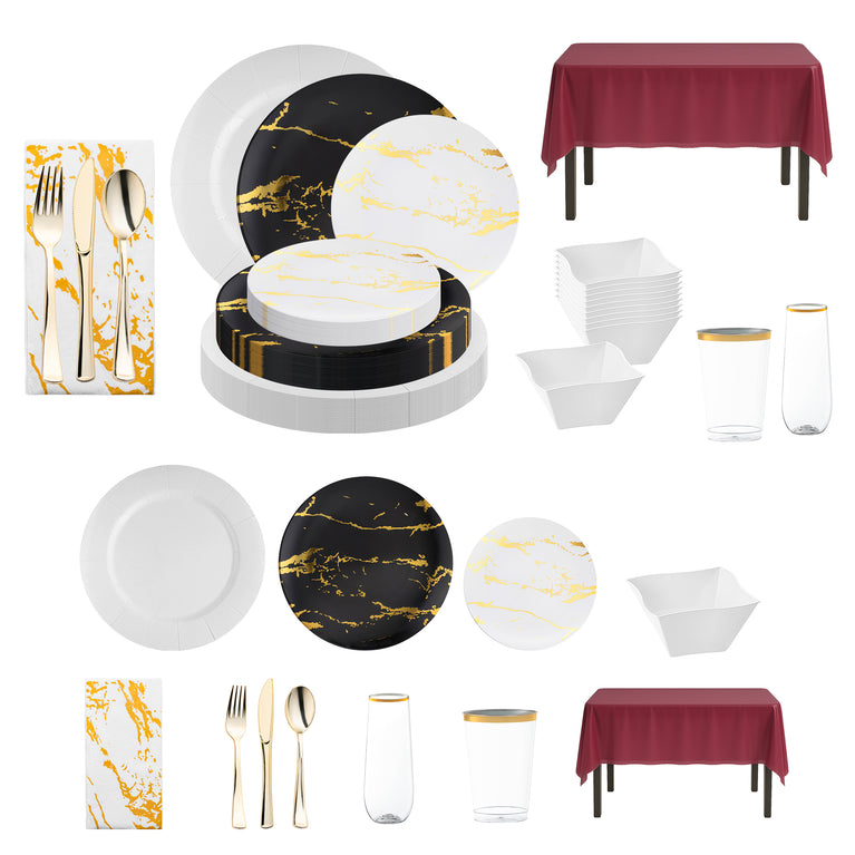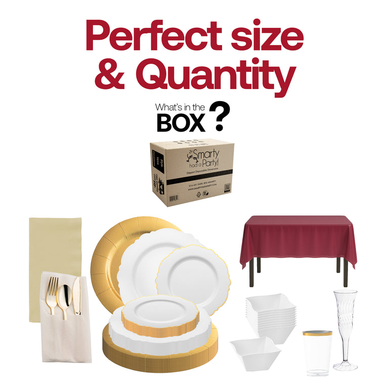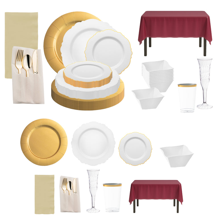 - Service for 50: 50 Charger Plates, 50 Dinner Plates, 50 Salad Plates, 50 Soup Bowls, 50 Forks, 50 Spoons, 50 Knives, 6 Tablecloths, 50 Dinner Napkins, 50 Tumblers, 50 Champagne Flutes