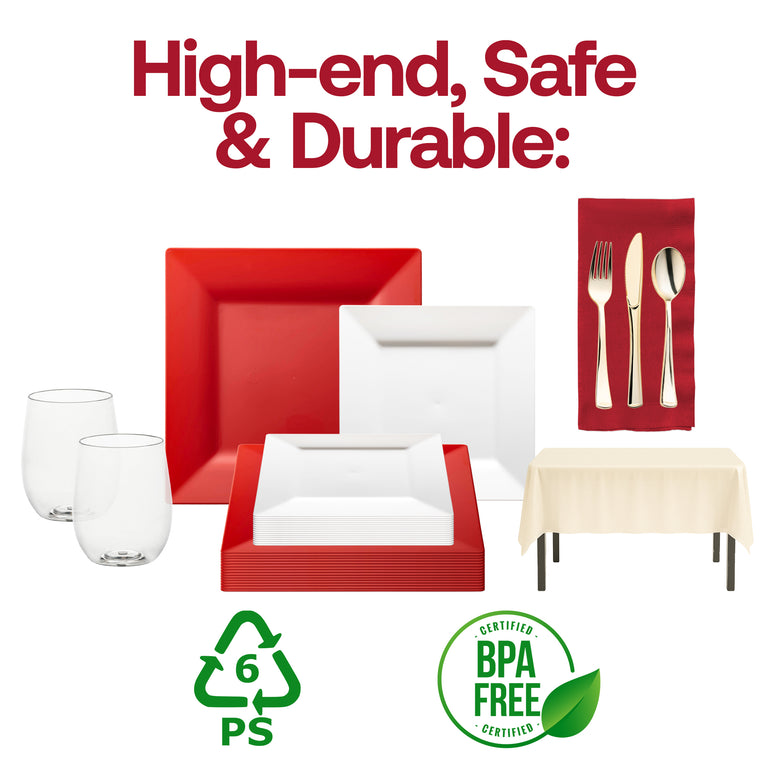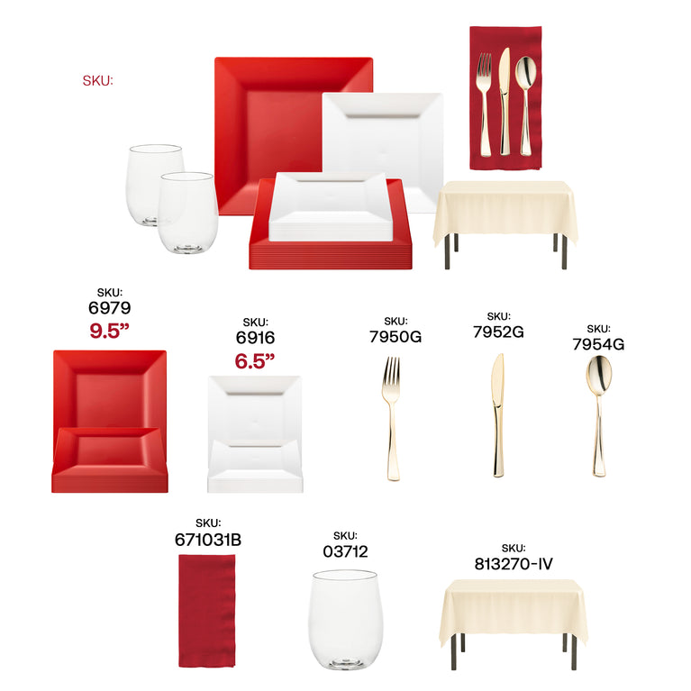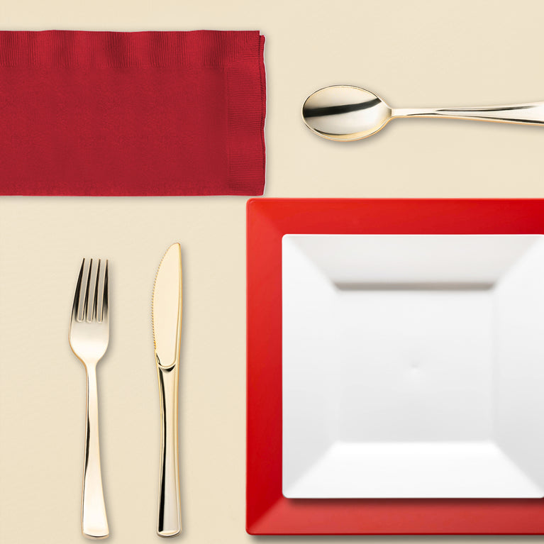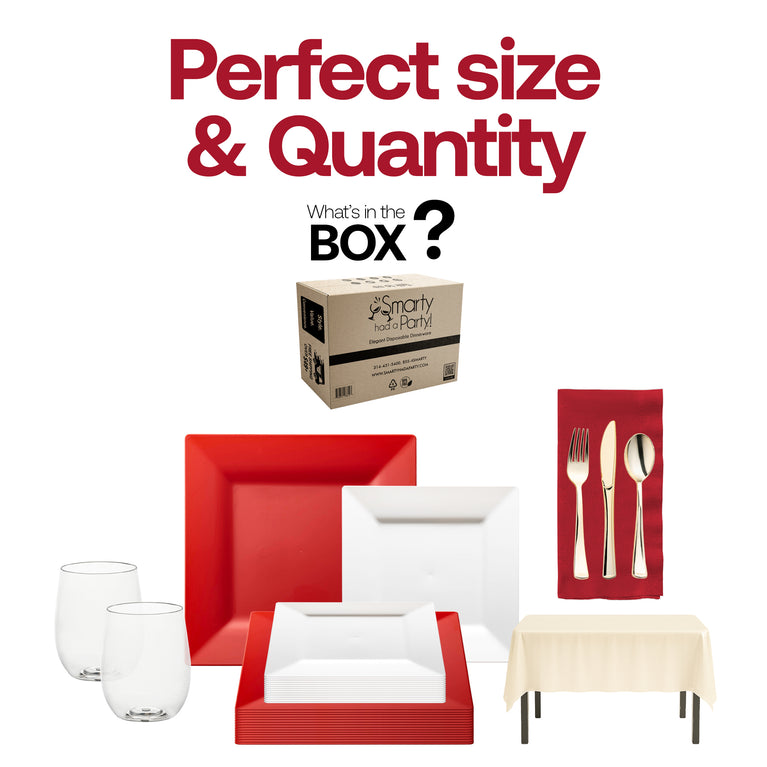 - Service for 20: 20 Dinner Plates, 20 Cake Plates, 20 Forks, 20 Spoons, 20 Knives, 4 Tablecloths, 50 Dinner Napkins and 20 Wine Glasses