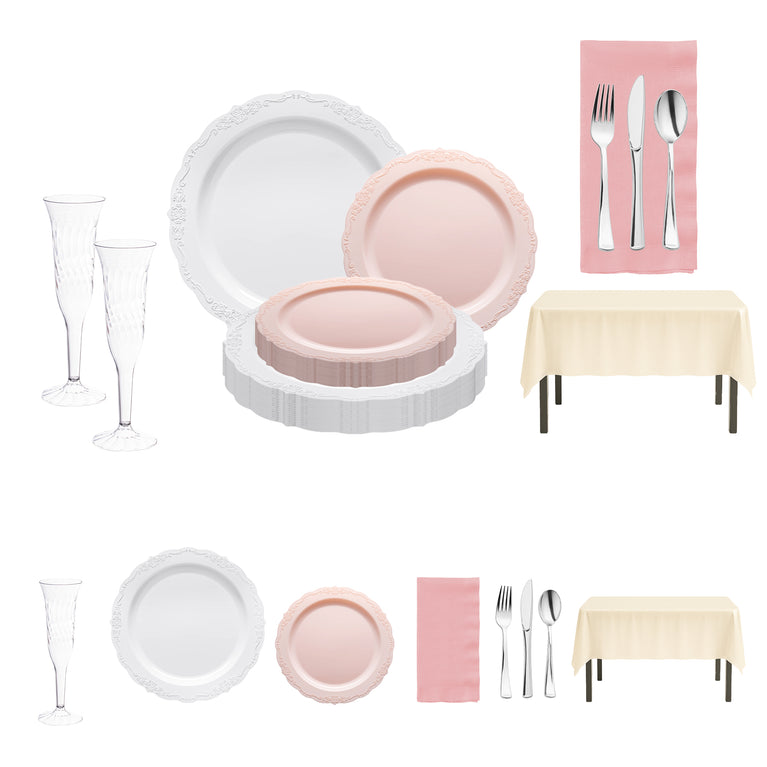 - Service for 60: 60 Dinner Plates, 60 Salad Plates, 60 Forks, 60 Spoons, 60 Knives, 8 Tablecloths, 100 Dinner Napkins and 60 Wine Glasses