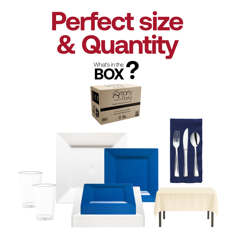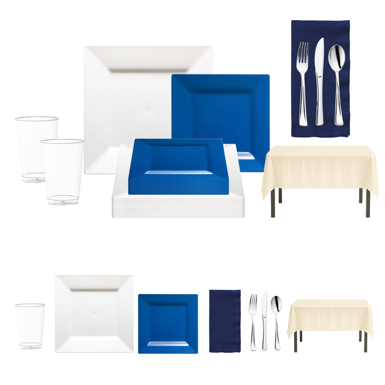 - Service for 20: 20 Dinner Plates, 20 Cake Plates, 20 Forks, 20 Spoons, 20 Knives, 4 Tablecloths, 50 Dinner Napkins and 20 Cups