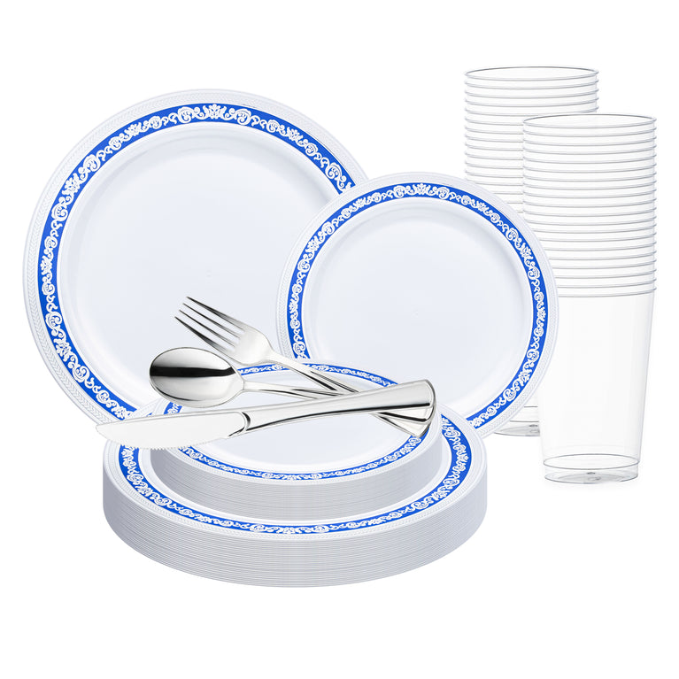 White with Blue and Silver Royal Rim Plastic Wedding Value Set