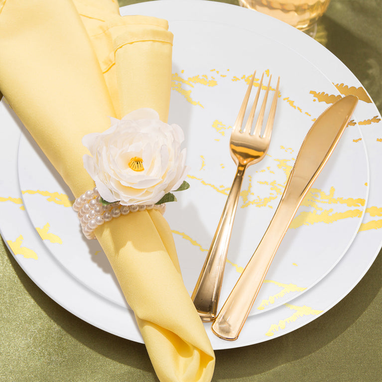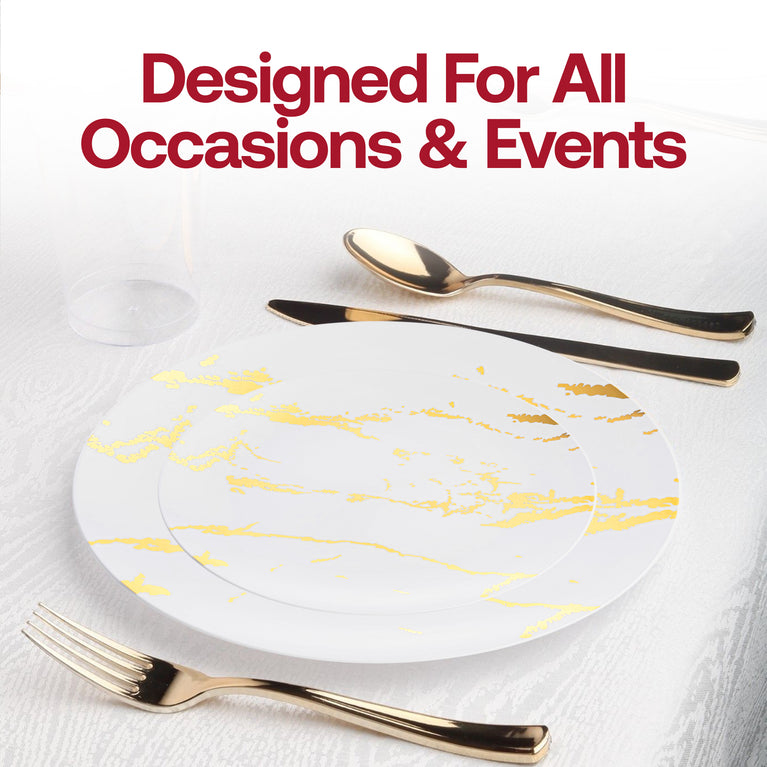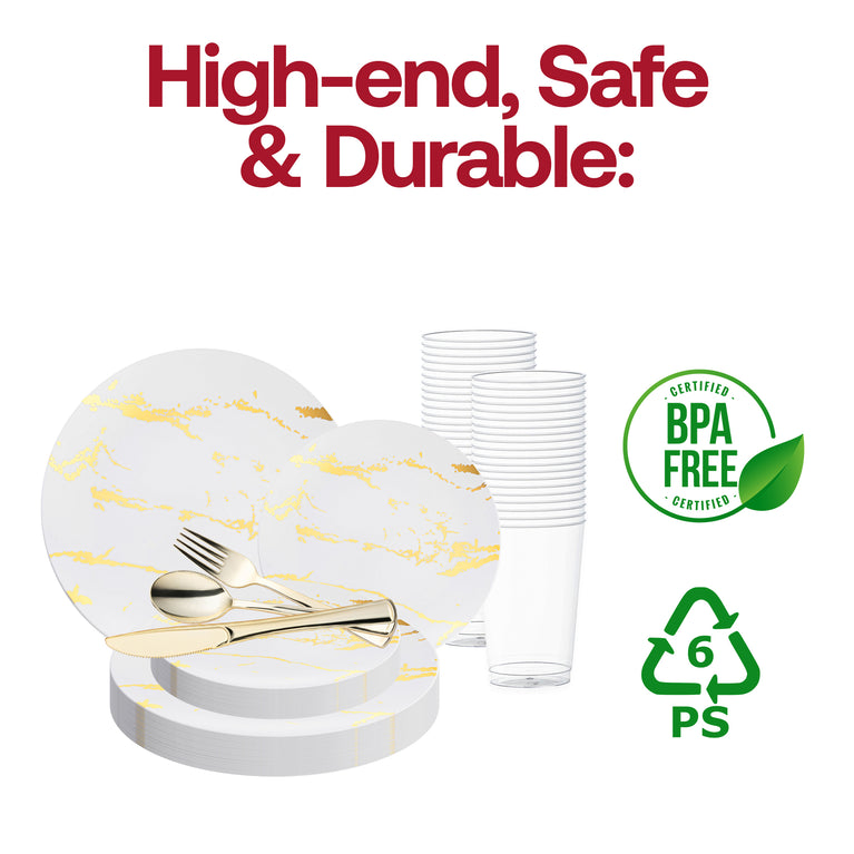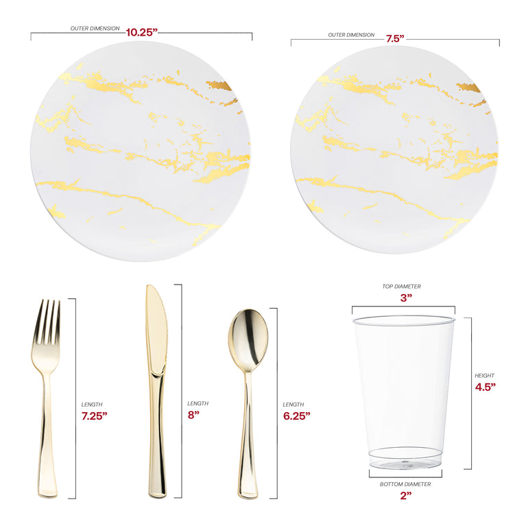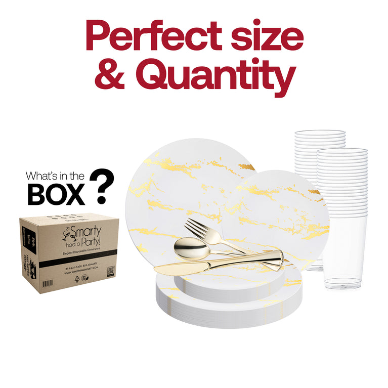White with Gold Marble Stroke Round Disposable Plastic Wedding Value Set