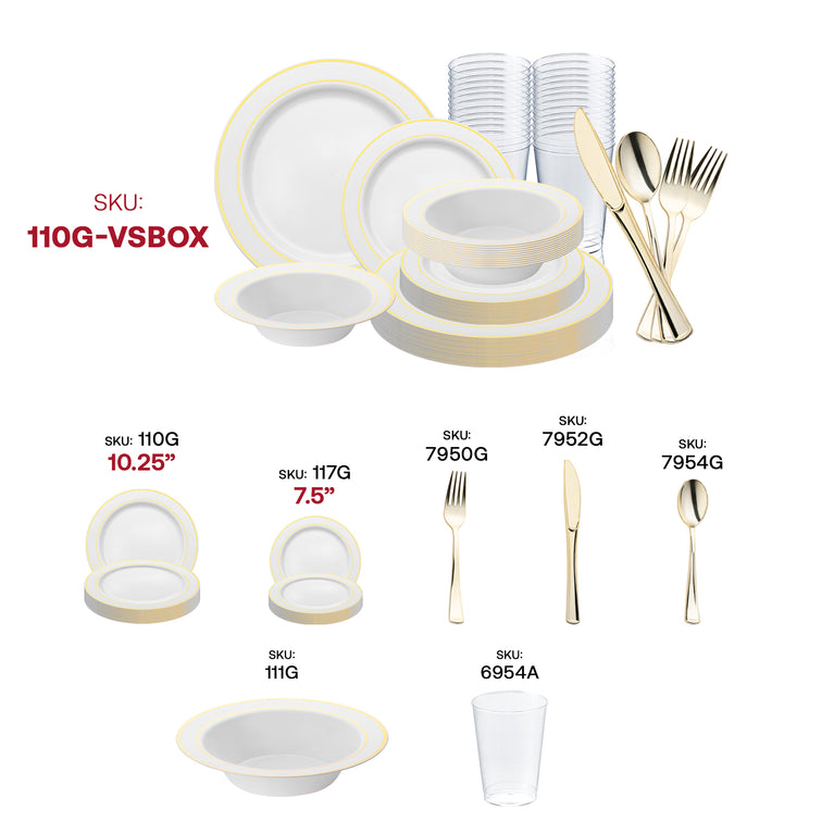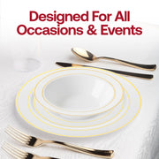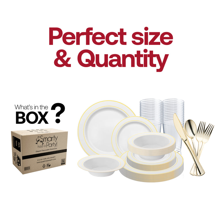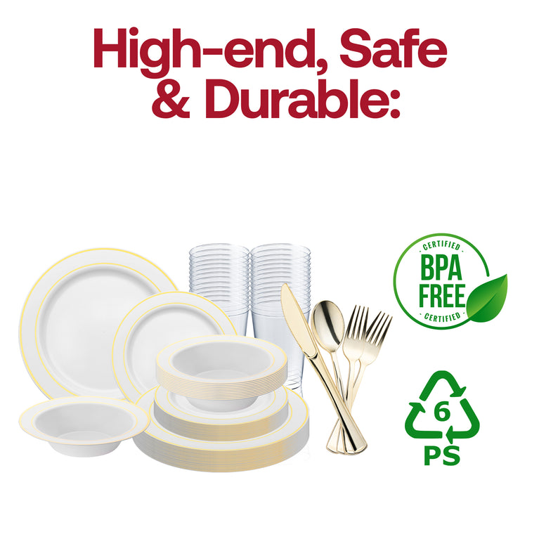 White with Gold Edge Rim Plastic Wedding Value Set - 120 Dinner Plates, 120 Salad Plates, 120 Bowls, 240 Forks, 120 Spoons, 120 Knives, 120 Cups