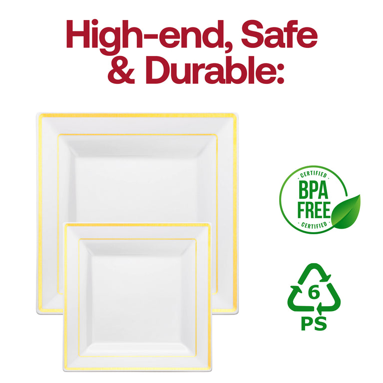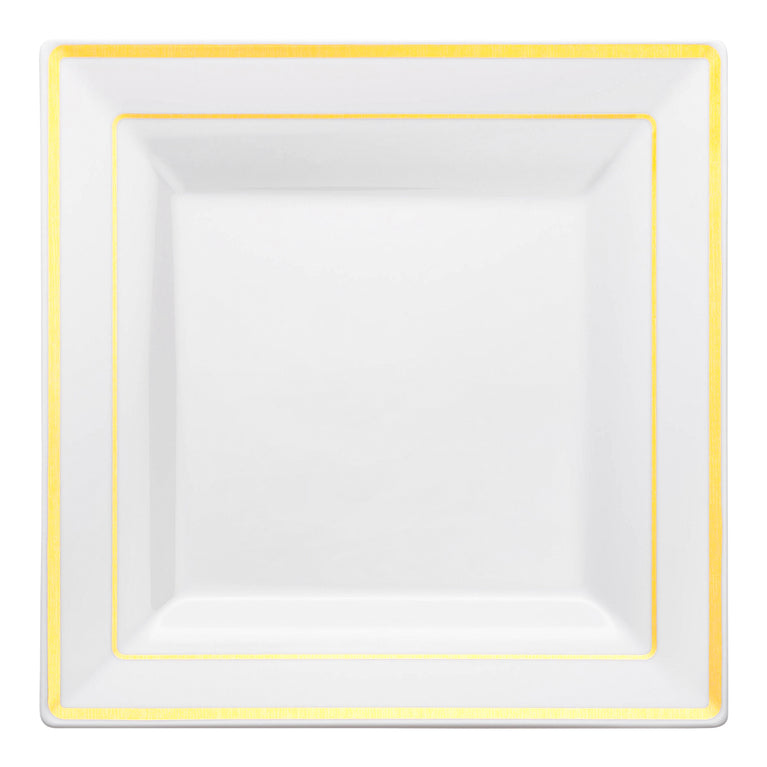 - Product Name: White with Gold Square Edge Rim Plastic Dinner Plates (9.5")